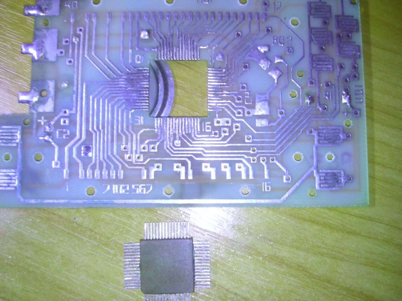 Экран нужно легонько снять с плати и положить на место в панель. Вероятно что резинки будут на экране, их можно легонько пройти спиртом. Проц отпаивать паяльником 25 Вт с острым жалом, нагревая ножку продвигайте под неё лезвие. Но может проще найти похожую игру с битым экраном но целой платой на каком нибудь молотке и заменить. Вот так выглядит: Вложение 859881 |