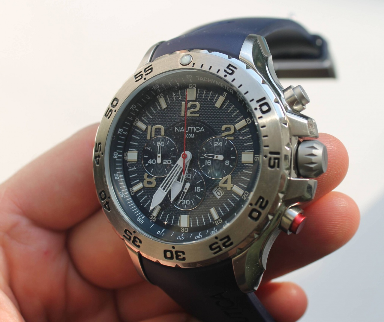 Вложений: 6 Заказал на ebay.  Nautica N14555g. Обошлись с доставкой около 3800 р. Синий резиновый ремешок и синий циферблат. Несмотря на размер около 5 см, на моей скромной руке не выглядят компасом. Носить очень удобно. Рука не потеет, ремешок без запаха. Часы очень хорошие и привлекают внимание красной кнопкой, серой головкой и комбинацией полированных и матовых граней. Безель вращается в одну сторону,водонепроницаемые. Идут точно. |