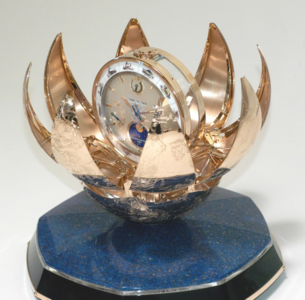 Итак, о моделях. В первой, под названием Philosophia, имеется только одна стрелка – часовая, но владелец имеет возможность узнать более точное время, активировав механизм минутного репетира, который озвучит часы и минуты в разной тональности. Изначально владелец часов Alex Ghotbi хотел иметь часы вообще без стрелок, предпочитая узнавать время при помощи боя репетира, но впоследствии изменил свое мнение. Кстати, инициатором названия модели также был он. Модель имеет впечатляющий набор усложнений – кроме репетира, клиент пожелал насладиться видом турбийона (на 6 часах) и индикатора фаз Луны с реалистичным изображением лунных кратеров. На обратной стороне корпуса размещен индикатор запаса хода с выгравированным созвездиями Большой и Малой Медведиц. Также, по желанию владельца (возможно, испанца) гравировка 1/1, обозначающая номер модели, была заменена на No Un/Un, что на испанском языке означает «один/один». Корпус модели выполнен из 18К розового золота. Мануфактурный механизм с калибром 2755 с ручным заводом отмечен Женевской печатью. Вторая модель называется Vladimir и, по заявлению производителей, на сегодняшний день является самыми сложными часами в мире, обогнав даже Tour de l’Ile. Механизмом с ручным заводом состоит из 891 детали и отвечает за работу 17 усложнений: минутный репетир, 60-секундный турбийон (на 6 часах), индикатор фаз Луны (на 3 часах), индикатор второй часовой зоны, индикатор дня/ночи (на 11 часах), индикатор запаса хода и 52-недельная шкала (на 9 часах). Эти указатели расположены на циферблате. На задней крышке можно увидеть круглые указатели вечного календаря, показатель уравнения времени в центре, индикатор високосного года (на 1 часе), время рассвета и заката (на 4 и 8 часах) и карта звездного неба в нижней части циферблата. Корпус диаметром 47 мм выполнен из розового золота, на его боковых сторонах выгравированы фигурки китайского гороскопа. Любопытно, что кропотливая работа по вырезанию фигурок заняла у мастеров студии Atelier Cabinotiers более полугода. Мануфактурный механизм с калибром 2750 с ручным заводом отмечен Женевской печатью. Что касается стоимости модели Vladimir, мы можем лишь строить гипотезы. Но если заявленная цена знаменитой Tour de l’Ile составила 15 миллионов франков, можно предположить, что ее «конкурентка» обошлась владельцу в сумму, не менее этой. Вложение 128705 Источник: http://www.watchnews.com.ua/new-prod...-vladimir.html |
