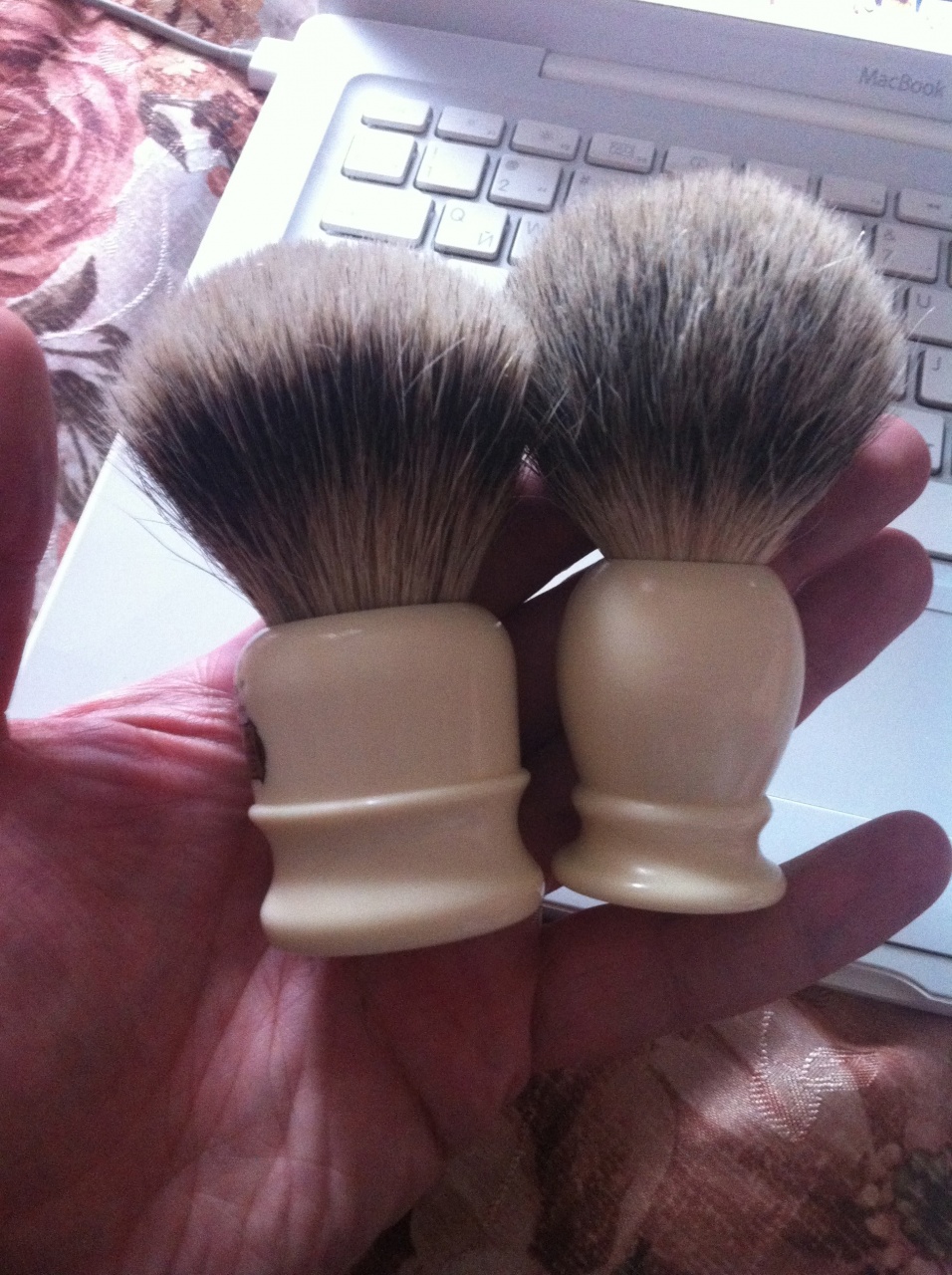 Добрался наконец то до почты. Итог похода- Симпсон, оба Брюта и....Тадам! Мыло от Майка. Странно, 24 Апреля выслали, сегодня уже забрал. Очень быстро в этот раз получилось, очень странно... Сразу по Симпсону. Пучок неимоверно тугой, рукоятка удобная и довольно крупная. Переживал по этому поводу, начитавшись отзывов, предполагал, что будет что то типа 2 костяшки шашечные, но нет. По размеру можно сравнить с рукояткой Мюлле, правда Мюлле несколько поуже.Промывать перед использованием обязательно. Промыл с мылом, вода текла РЫЖЕГО цвета. Как взбивать в скаттле мыло- так пока и не въехал, на лице взбивает, в скаттле не хочет. Самое обидное, что Симпсон не влезает в старую подставку для помазка. Надо что то думать. Ну, а в остальном все норм. Станок Меркур, 6-4-4,5. Три прохода, Флоид. Брют пока не пробовал.