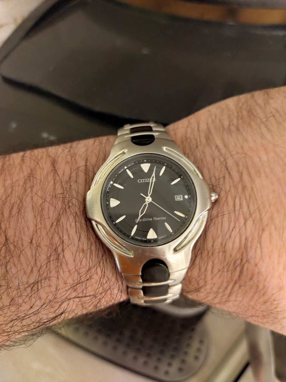 Ретрофутуризм нулевых: Элемент Пельтье, литиевый АКБ, интегрированный браслет из стали и пластика с застёжкой-бабочкой... Обожаю безумие этих часов. |