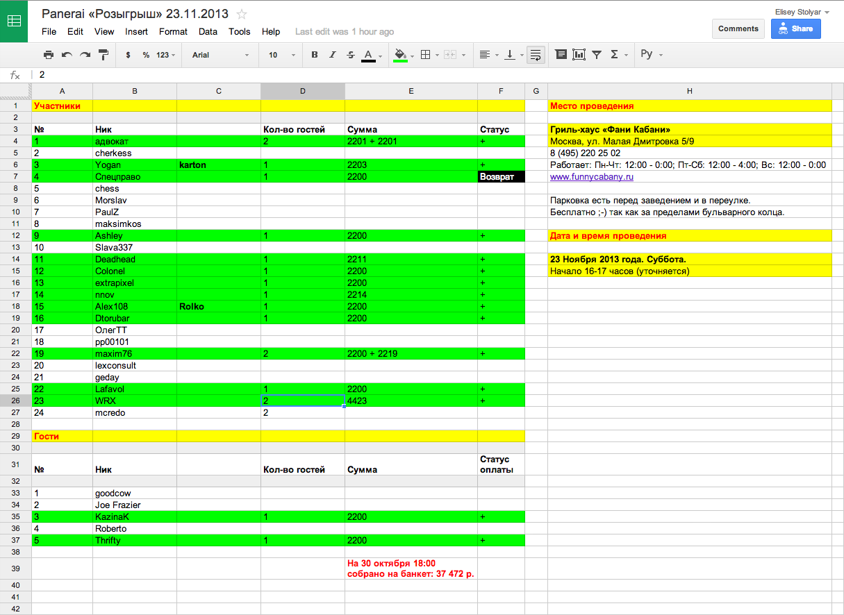 Был лимит в 2500, стал в 500... Писать не могу. Но прочел ваш вопрос: самый простой способ — кидаете мне на телефон 2200. Номером, надеюсь, с вами поделятся. Пожалуйста, те, кто получил реквизиты и мои контакты для оплаты банкета, поделитесь ими :) Не хочется писать их в открытую. ___ ОТЧЕТ на 30 октября 19:20 по деньгам на банкет Собрано: 37 472 р. За 17 человек. 12 участников, 5 гостей. Список онлайн На всякий случай, прилагаю скриншот списка/таблицы Вложение 552828 |