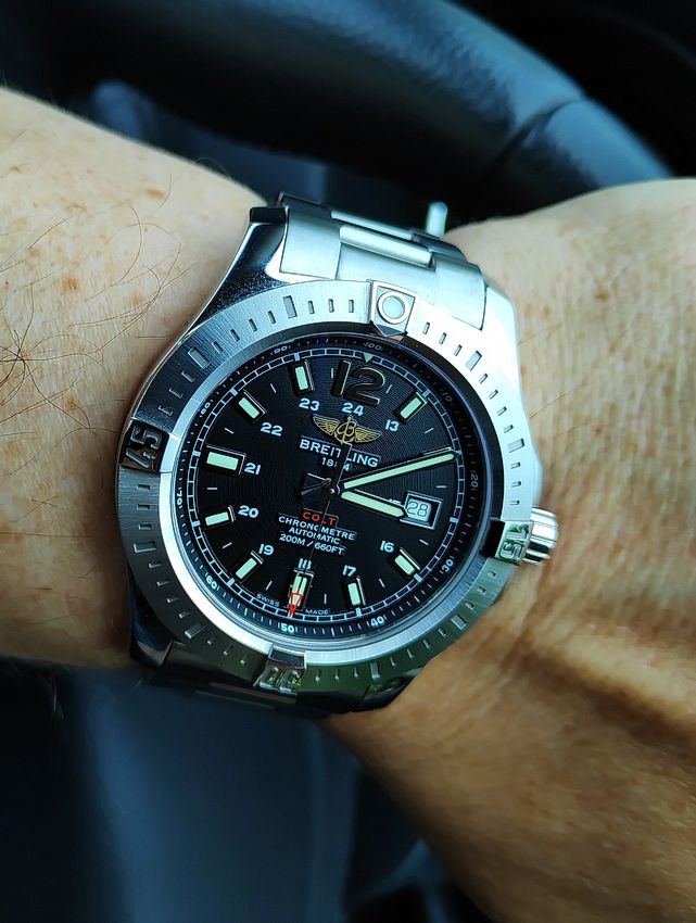 Пересадил навитаймер на браслет. Теперь часы намного лучше выглядят. Ремешок родной продал за ненадобностью. Хотя браслет в сравнении с тем, что стоит на супероушене 44мм, выглядит менее основательно. Я вначале вообще подумал, что мне впарили браслет с реплики.