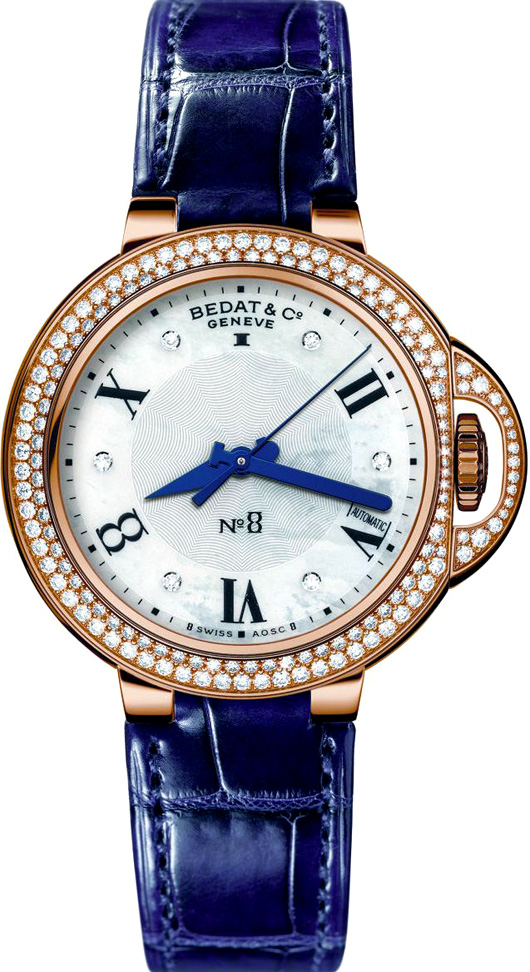 Новинка названа так-же, как и название коллекции - No 8 (ref. 828.440.90). Она имеет круглый корпус из розового золота, диаметром 36,5 мм, водонепроницаемый до 50 метров. Заводная головка защищена дугообразной скобой. Скоба и корпус инкрустированы 151 бриллиантом, общим весом 1,53 карата. Циферблат перламутровый с бриллиантовыми часовыми индексами, которые чередуются с большим римскими. На 8 часах - фирменная стилизованная арабская восьмерка. Индикация времени осуществляется с помощью центральных вороненых часовой, минутной и секундной стрелок. Модель оснащена автоматическим калибром ETA 2892A2. Ремешок из кожи аллигатора с застежкой из нержавеющей стали или браслет "Mille mailles" из 18-каратного розового золота с застежкой из нержавеющей стали. Источник: http://watches.infoniac.com/no-8-bed...-co-watch.html |