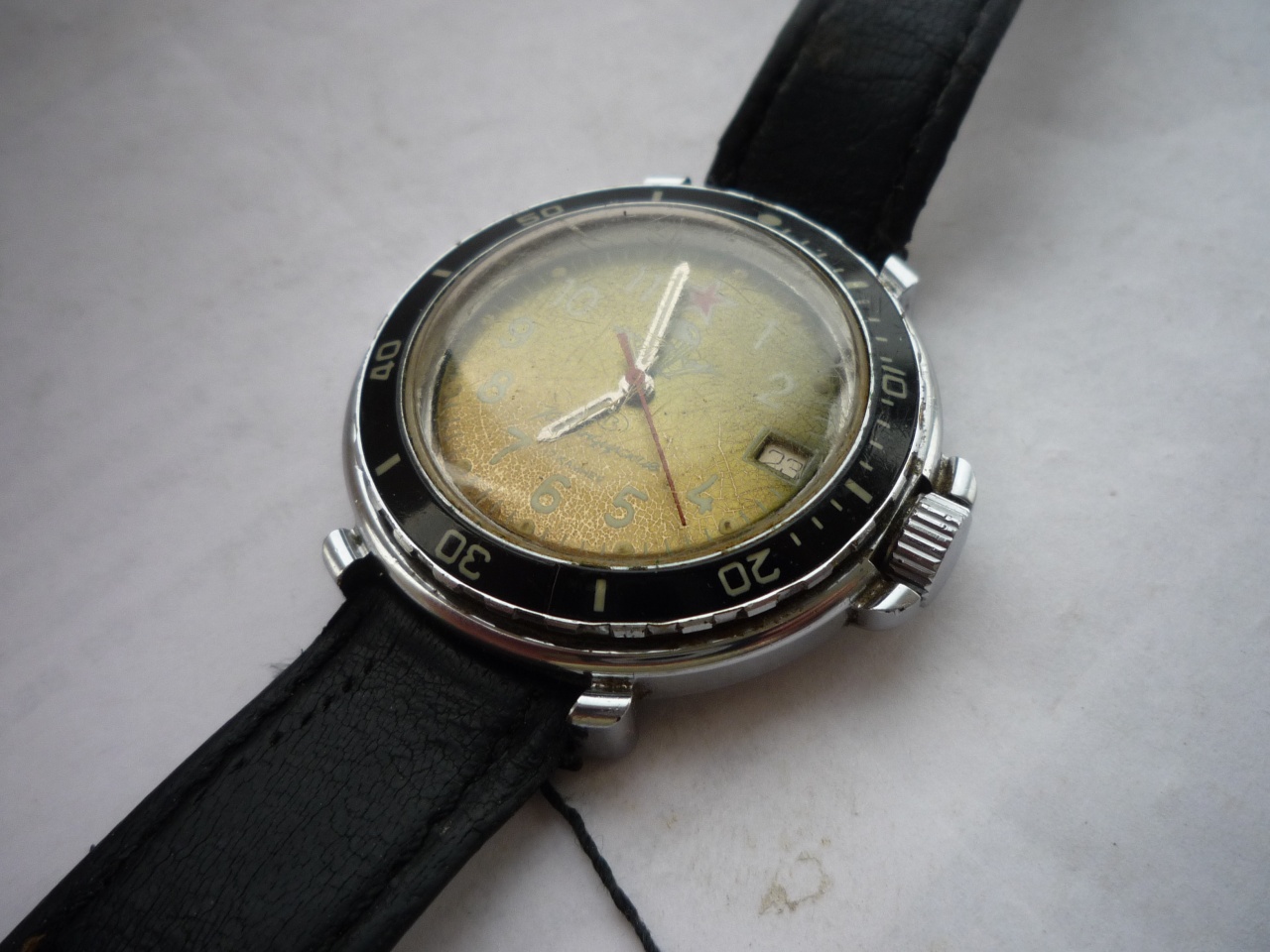 Буквально на той неделе приобрел вот такие Командирские, в идентичном корпусе. Со слов продавца , да и по состоянию стекла и ремешка , послужили они немало. Тем не менее нижняя сторона практически без утрат покрытия, хотя царапин на нижней части много. Только на зг слегка повреждено. Ходят точно.