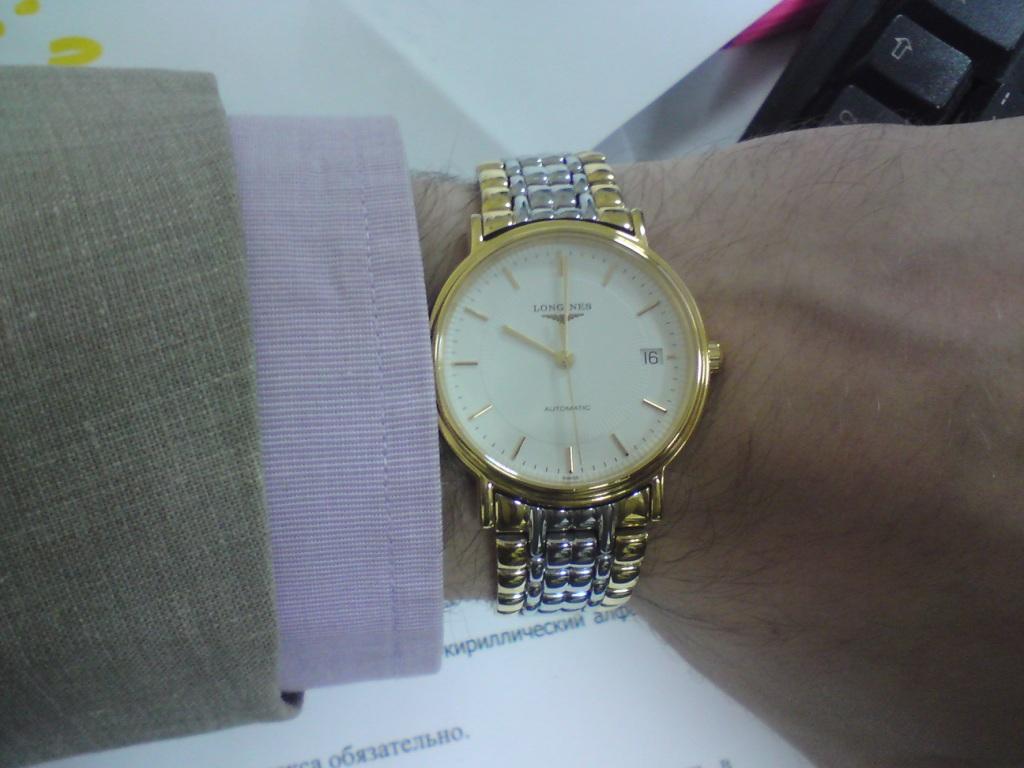 Ниже - фотография 34 мм Лонжина на моей руке - сорри, из Омеги у меня только Симастер. По-моему нормально смотрится, под костюм - самое оно.