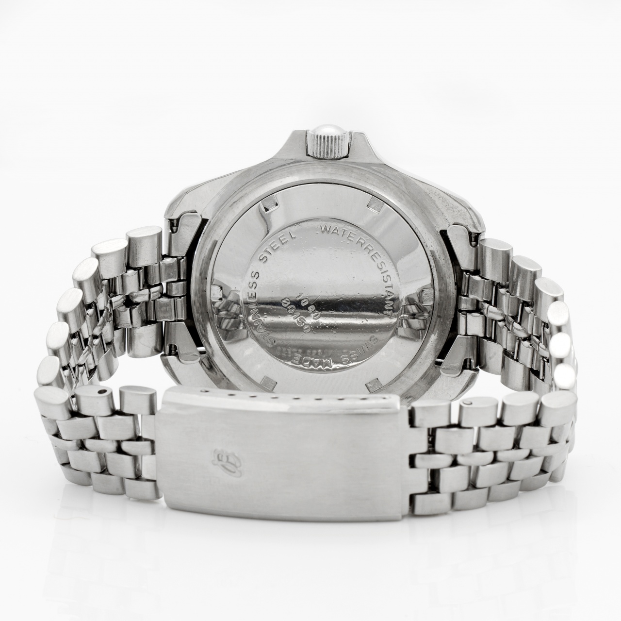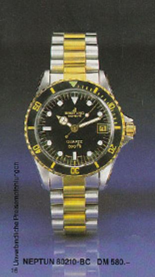 В то время, в 1979 году компания была приобретена Эрнестом Шнайдером, а позже, в 1982 году переехала из Женевы в Гренхен (поэтому на цифере еще присутствует надпись “Geneve”). Страничка каталога 1980 года, посвященная SuperOcean, выглядит так: Вложение 1811216 Вся линейка в то непростое время состояла исключительно из кварцевых моделей на калибрах AS ESA 536.121. Этот механизм был довольно популярен тогда среди производителей кварцевых часов, например Heuer использовали его в своих моделях. Примечательно, что на механизме присутствует клеймо как AS, так и ESA. Вложение 1811217 На самом деле, не совсем понятно, к какой линейке относился 80150, т.к. в каталоге эта модель не видна, а реф (да и внешний вид часов) больше похож на Transocean того же периода (Transocean 80160, 80170), Вложение 1811218 но из-за более крупного размера многие относят эти часы к SuperOcean, т.к. женские варианты дайверов, а также женские модели линеек Tabarly, Cup относились к линейке Transocean, в то время как мужские варианты – к SuperOcean. Итак, SuperOcean 80150 Вложение 1811219 Вложение 1811232 Часы выпускались в корпусе 40 мм, Размеры: Диаметр без ЗГ – 41, по безелю – 38, с ЗГ – 45. Высота 47мм. Минеральное стекло. Цифер черного цвета, металлические стальные метки часов с люмом. Типичный для дайверских часов безель, наплыв на корпусе для защиты головки. Сама ЗГ завинчивается. В общем, дизайн весьма схож с современными SuperOcean. В отличие от других SO того времени, модель имеет также индикатор дня недели. Кроме того, корпус часов идентичен корпусу модели Heuer Monnin 844 (первый дайвер, выпущенный Heuer на французском механическом калибре Felsa 4611A, а также кварцевую версию). Вложение 1811233 SuperOcean 83110 имеет более крупный стальной корпус диаметром 44 мм, высота 47мм, ширина браслета 20мм. Надо отметить, что браслеты были разные на всех SO образца 80 года. Что самое примечательное, форма корпуса выполнена в форме подушки (a-la Doxa), заводная головка смещена в положение 4 часа. Циферблат черный, маркеры – сталь с люмом, стрелки крупные, с люмом. Немного необычный безель – внешнее кольцо подвижно относительно внутреннего (a-la Navitimer), на внешнем кольце – красная точка – нулевая отметка, на внутреннем – желтая точка. Вид сзади: Вложение 1811234 SuperOcean 80330 объединяет в себе черты обеих моделей, описанных выше, а также модели 80210: корпус-подушка, но ЗГ на 3 часа, с защитным наплывом на корпусе (но надо отметить, что у 80330 дужки заострены на концах, а у 83110 – плоские), часовая и минутная стрелки как у 83110, а секундная стрелка и маркеры-люм как у 80210, типичный дайверский безель. Но ремень – трехрядный, внешний вид которого ближе к современному Professional браслету. SuperOcean 80210: Классический дайвер из стали, диаметром 40мм, черным цифером, классическим дайверским безелем, завинчивающейся ЗГ и с минеральным стеклом. Часовая стрелка отличается от остальных моделей (на конце круг с 3 лучами (вообще эта модель больше всего похожа на Heuer Mannin) Параллельно с этими моделями выпускается модель SuperOcean Tabarly, описанная в заглавном посте (т.к. выпускалась на протяжении всех 80х) В 1983 году, когда положение компании начинает стабилизироваться, коллекция немного меняется: Модель 83110 получает новый безель и надпись на цифере дополняется “300T”. Вложение 1811235 A модель 80210 теперь получает название Neptun. Выходит биколорная (сталь-золото) версия этого SO. Вложение 1811236 Кроме того, выходит SuperOcean Deep Sea 81190 (описан в заглавном посте) – глубоководный дайвер 