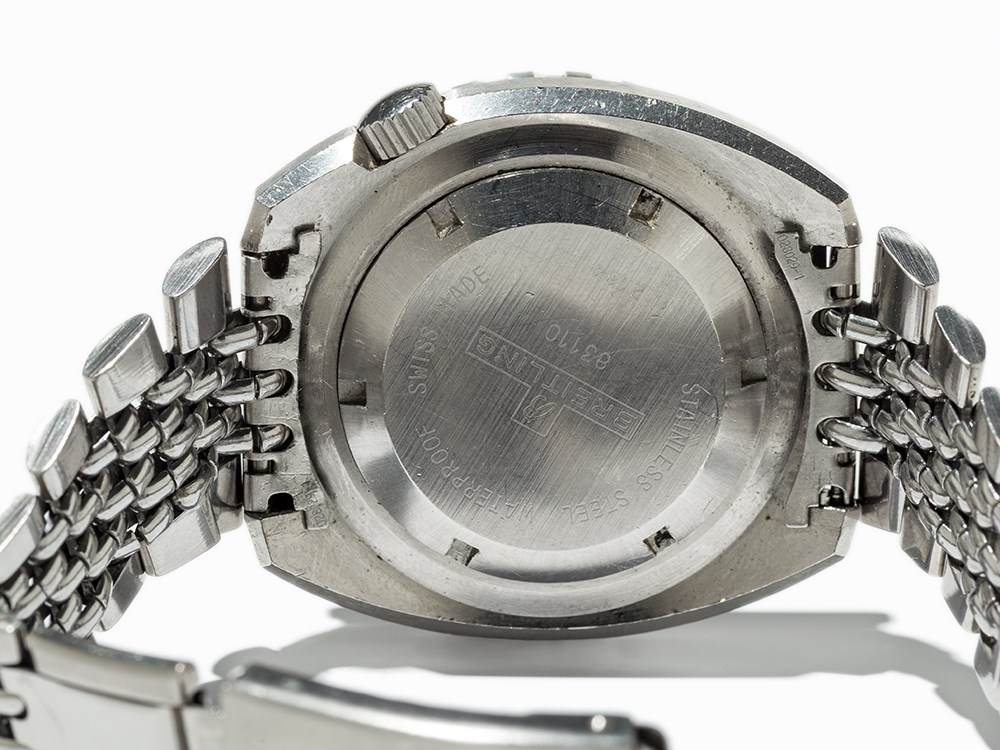 SuperOcean Chrono-matic из 70х. Ref модели: 2105. В 70е годы, помимо SuperOcean ref 2005 на калибре Valjoux 7731 (описан выше), выпускался еще вариант SO Chrono-matic 2105. Часы выпускались на знаменитом калибре автоматического хронографа: Caliber 11 (а затем 12), представленном в 1969 году содружеством Breitling, Heuer, Buren, Hamilton, Dubois Depraz. Модель Chrono-matic была добавлена почти в каждую из выпускаемых лиенеек (Chrono-matic, Navitimer Chronomatic, Navitimer Cosmonaut Chrono-matic, Chronomat Chrono-matic, TransOcean Chrono-matic, ну и, собственно, SuperOcean Chrono-matic). О калибрах 11 и 12 много всего написано, много споров на тему "кто же был первый". Если коротко, то это модуль хронографа DD 8510 на базе калибра Buren 1281 с микроротором. Сам SuperOcean Chrono-matic был представлен на Базеле в 1970 году. Примечательно, что модель выпускалась изначально в довольно крупном корпусе – 48мм, имела водозащиту 200М. Корпус изготовлен из матовой нержавеющей стали, безель: наружная часть - черного цвета, внутренняя часть безеля – белого цвета. Циферблат – матового черного цвета с белыми колодцами счетчиков хронографа. Стрелки позволяют легко считывать показания благодаря своему яркому цвету. Часовые метки – аккуратные квадраты (прямоугольник на 12 часов, полоски на 3 и 9 часов) люминофора. Как и на остальных Chrono-matic заводная головка вынесена на левую сторону корпуса. Дата – на 6 часов, красным цветом на белом фоне. Вложение 1809288 |