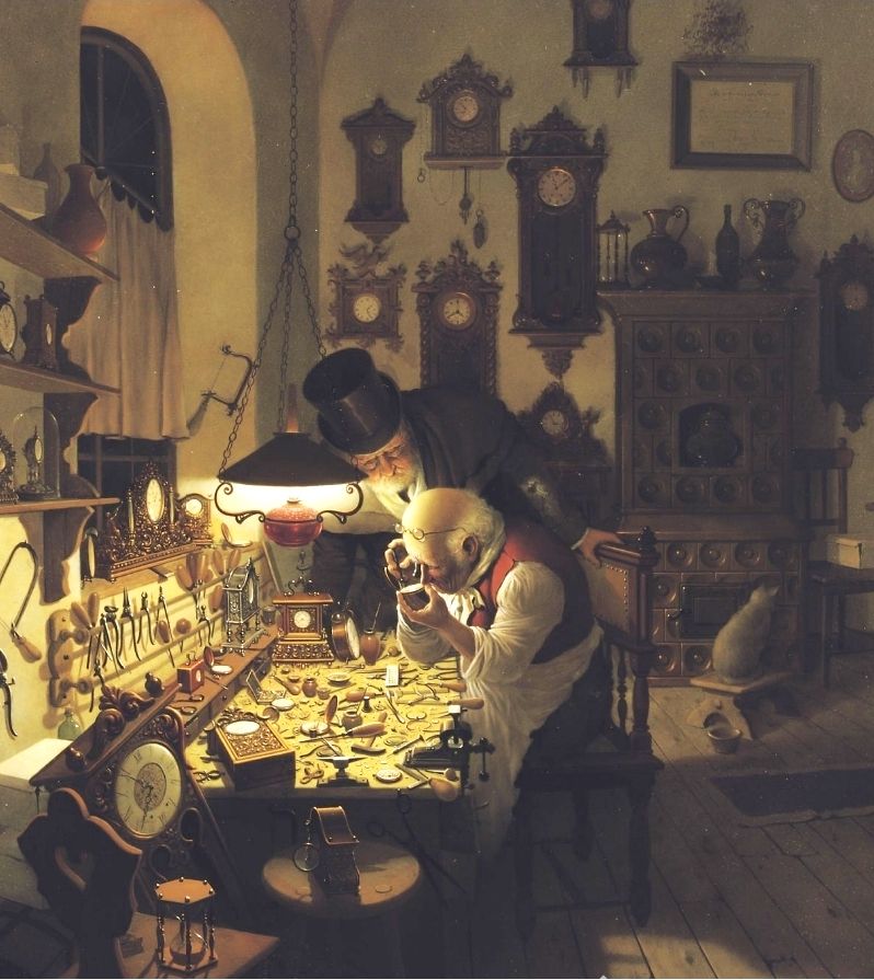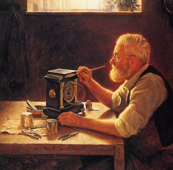 Я сегодня подойду к одинокому еврею. (Там на площади будочки выстроились в ряд.) «Гражданин часовщик, почините мне время. Что-то часики мои барахлят...» Vida Gabor (Hungarian, 1937-1999) «Wonderful watches» Jules Zermati (Italian, act. 1880-1920) «The Clockmaker» 1900 *(click.1194×917 пикс,156 Кб) Norman Rockwell «Clockmaker» *(click.1024×768 pix.187 Кб) Roberts fine art (?) «Doctoring old time watchmaker» 1877 Сергей Феденко «Часовой Мастер» J.F.Kernan «Clockmaker» Greg Olsen «Clockmaker» Enoch Wood Perry «The Clock Doctor» 1871 Charles Spencelayh Это, наверное, не часовщик, а просто рачительный хозяин, который часы в доме сверяет по курантам. Но пусть будет. Уж очень он мне нравится :) Sam (?) «Watchmaker» William Wetmore (?) «Watchmaker» Andrew Reed «The Young Watchmaker» |