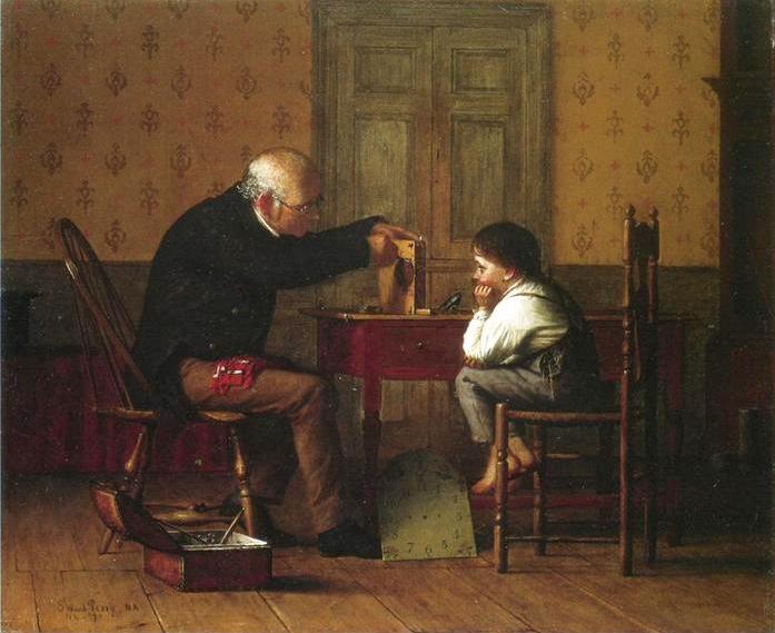 Вскоре после того, как в 1658 году нидерландский механик, физик и математик Христиан Гюйгенс (Christiaan Huygens) (14 апреля 1629 – 8 июля 1695) изобрел маятник, пришло время напольных часов. Свободно стоящие и достаточно высокие, чтобы разместить гири и маятник, напольные часы стали воплощением мечты. Напольные часы очень быстро создали себе общественное положение основной части интерьера и стали эпицентром внимания гостиных и залов во времена, когда именно зал был тем местом, где принимали посетителей и гостей. Вложение 124075 Lars Jorde Grandmother. 1898 г. Одним из факторов, обеспечивших невероятно быструю популярность этого вида часов, был также и психологический фактор, которому не придавалось должного значения. До того как были изобретены первые механические музыкальные средства (музыкальная шкатулка появилась более чем столетие спустя), большой дом представлял собой довольно тихое место, оживляемое лишь светскими разговорами и болтовней прислуги. Равномерный ход напольных часов создавал размеренному и отлаженному быту спокойный звуковой фон. Поэтому неудивительно, что богатые люди стали заполнять свои дома напольными часами. Вложение 124076 Sigvard-Marius Hansen Brev. Вложение 124077 Sigvard Hansen Interior. Первые напольные часы были узкими и не очень высокими - в среднем шесть футов и шесть дюймов. Однако, со временем дизайн изменился на более высокий и широкий, как по причине престижа, так и с целью увеличить пространство для широкого хода удлиненного маятника. Приблизительно до 1675 г. дизайн напольных часов был аскетичный и формальный, но с появлением витых колонн оформлению верхней части часов стало уделяться особое внимание. Несмотря на то, что циферблат, за исключением пазух свода, оставался без излишеств, верх роскошно украшался. Вложение 124078 Adrien Harmand Waiting for the Coach. Краснодеревщики довольно скоро увидели в напольных часах прекрасную возможность рекламировать свою работу. Совершенствование дизайна корпуса, как в зеркале, отражало значительные успехи в производстве мебели, широко применялось ореховое дерево и новые технологии - резьба, лакировка, стиль французской мебели буль (медь и черепаший панцирь). Края дверей шкафчика часто украшались орнаментом в виде лепнины, скрывающей зазор между дверью и корпусом. Вложение 124079 Henri de Braekeleer De oude herberg Het Loodshuis in Antwerpen. Корпус напольных часов состоит, как правило, из трех частей: верхняя часть, шкафчик и постамент или тумба. Тумба, как самая нижняя часть, обычно соприкасалась с полом, однако из практических соображений нередко устанавливалась на шарообразных ножках. Во времена, когда неровность пола в доме считалась обычным явлением, было гораздо легче установить часы в идеально вертикальном положении, отпилив часть ножки, чем подогнать тумбу или постамент. Размеры тумбы иногда менялись в зависимости от высоты помещения. Вложение 124080 Edward Lamson Henry Interior at Petworth. 1886 г. По центру корпуса делалось круглое или овальное окошко "яблочко" из обычного или рифленого стекла, чтобы можно было наблюдать движения маятника. Развитие часового дела требовало от часовщиков идти в ногу со временем, изменяя дизайн циферблата и форму цифр. До 1690 г. размер циферблата составлял 10 дюймов, с 1690 по 1700 гг. он был увеличен до 11 дюймов а арочный циферблат достигал 12 дюймов. Приблизительно между 1660 и 1665 гг. на циферблате наносились цифры небольшого размера; в перио