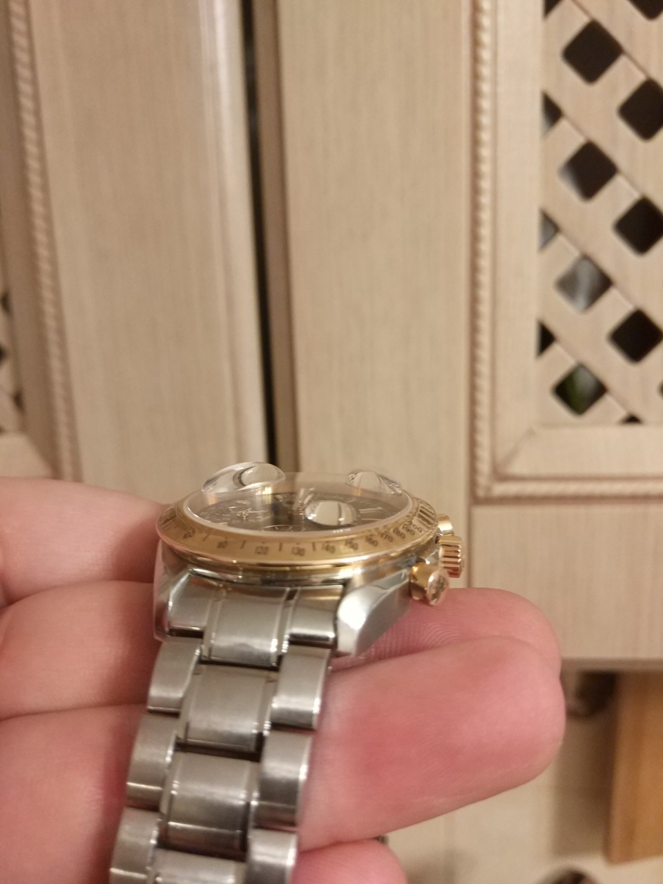 я сам удивляюсь как на таких дорогих часах и плекс!) и минус был что он сильно выпуклый по краю был и царапинам сильно подвержен ну и стрелки искажал.  |