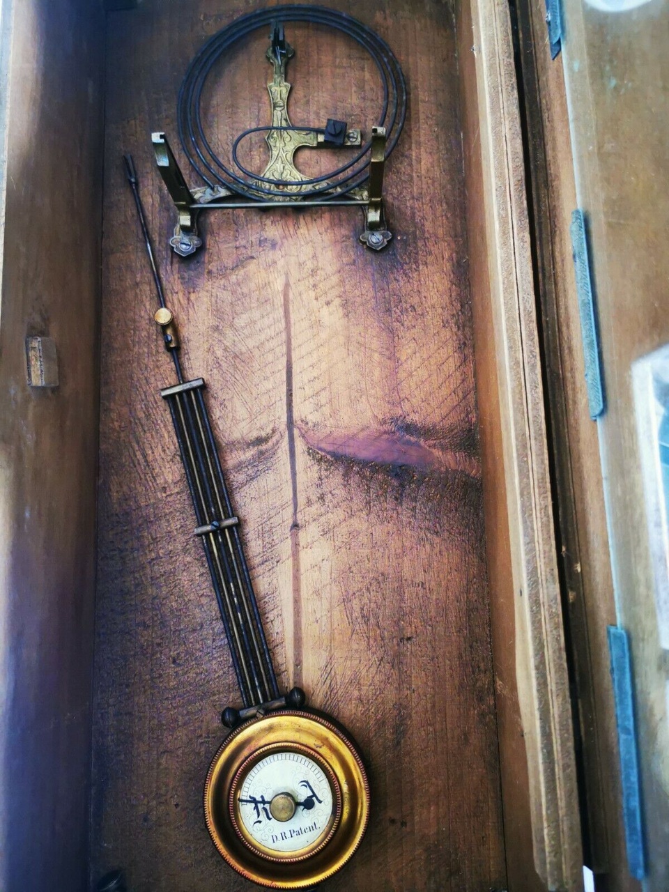 Маятник интересный, но интерес к нему "меркнет" , а глаза смотрят на "брутально" обработанную, цельную с серцевиной и сучками , без шпона доску задней стенки . Верх "изящества" и красоты корпуса (или такой реставрации ) часов.
