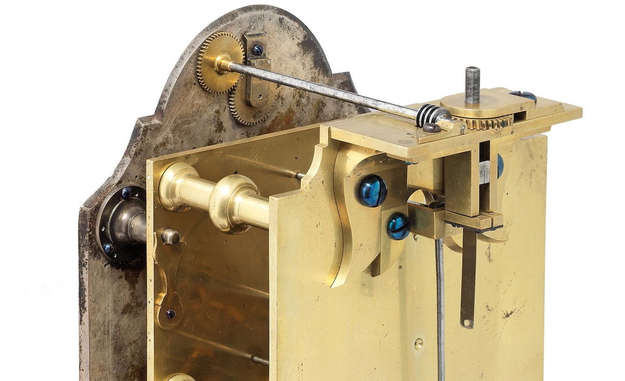 Механизм примерно середины 18 века с месячным запасом хода, имеет dead beat спуск и винтовую регулировку положения скобы анкера относительно поводка маятника. Маятник сконструирован самим Э. Стержень маятника представляет собой стальную и латунную пластины, скрепленные между собой десятью стальными винтами. В центре линзы маятника за стеклом видны рычаги и винт микрорегулятора. Снизу линза поддерживается стальной пружиной ( на приложенной гравюре можно видеть раскрытую книгу, где видна аналогичная линза маятника ). Основная регулировочная гайка линзы маятника здесь отсутствует. Регулировка длины маятника, как и в большинстве регуляторов Э., здесь осуществляется рычажком в дополнительном диске верхней части циферблата и далее через привод «бесконечный винт». Привод «бесконечный винт» встречается и в других регуляторах Э., но именно этот уникален тем, что имеет дополнительное усовершенствование. В центре стрелки регулировки маятника находится кнопка-штифт, при ее нажатии через ряд стальных рычагов происходит сжатие змеевидной пружины, фиксирующей дополнительные зажимы пендельфедера. Еще одной особенностью является деревянный импульсный штифт на поводке маятника. Неизвестно, является ли он оригинальным или нет, однако, он безусловно великолепно изготовлен и имеет следы времени. Возможно, это еще один пример постоянных поисков часовщиков, ищущих способы улучшить хронометраж. Корпус регулятора более поздний, примерно начала 19 века, но в целом выдержан в общей стилистике регуляторов второй половины 18 века с тем лишь отличием, что дверца маятника имеет стекло. Джон Элликотт родился примерно в 1706 году в семье часовщика. Его отец был очень успешным часовщиком и помощником при дворе Worshipful Company of Clockmakers. Джон-младший обладал невероятным талантом и в возрасте 22 лет обосновался на аллее Свитингс, 17 ( Sweetings Alley ), недалеко от Королевской биржи. Он особенно увлекся исследованием роли, которую различные металлы могут играть в точном часовом деле, и в октябре 1736 года представил свою статью «Описание и способ использования прибора для измерения степеней расширения металлов под действием тепла» Королевскому обществу, позже опубликованную в Philosophical Transactions. В 1738 году Э. был избран членом Королевского общества, проявлял большой интерес к научным вопросам и содержал обсерваторию в своем доме в Хакни ( Hackney ). Наиболее известен своей работой над маятниками с температурной компенсацией и использованием цилиндрического спуска. Элликотт заработал репутацию мастера дизайна и исполнения и в 1762 году стал часовщиком короля Англии Георга III. У Э. также были очень тесные отношения с испанской королевской семьей. И хотя домашние часы составляли львиную долю его бизнеса, он, без сомнения, был одним из лучших изготовителей хронометров. Когда летом 1761 года Королевское общество послало Чарльза Мейсона ( Charles Mason ) наблюдать за транзитом Венеры по диску Солнца, они приобрели регулятор Элликотта по цене £ 35-8s-0d. Другой регулятор сопровождал Джеймса Кука в 1769 году во время второго транзита Венеры. Также один из его регуляторов были куплен Гарвардским университетом, и оставался их главным хронометром до 1840 года. Регуляторы Ellicott, специально предназначенные для путешествий, поставлялись в характерных сужающихся корпусах - на сегодня таких известно четыре. Ег