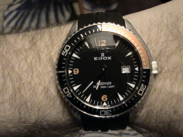 Я уже 3 года пользую кварцевый дайверский Edox(200м). Беру его на моря и реки. Часы были подарены, и вначале я хотел было их продать,но передумал, о чем не жалею. Да, марка - не из престижных, но за 4 поездки на Красное и Средиземное море, они показали себя с лучшей стороны. Плавал, нырял, валялся на пляже,прыгал в бассейн- хоть бы хны!Так что( а эта модель была представлена в обсуждении), хоть и не являюсь поклонником данной марки, но могу порекомендовать как хороший дайверский недорогой вариант.