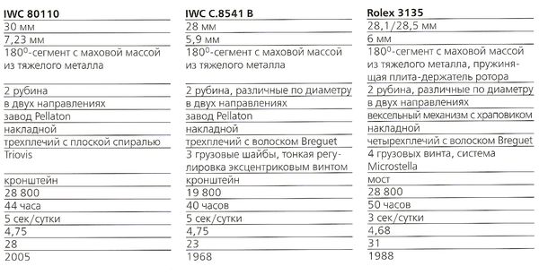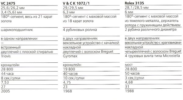 Прежде всего, позвольте пояснить: автор не работает по совместительству у фирмы Rolex сотрудником по связи с общественностью, но пока еще получает кое-какие знаки внимания от марки с эмблемой в виде короны. То обстоятельство, что выбранный образцом Калибр 3135 так легко отделывается от оценки, объясняется исключительно техническими факторами. Автоматический калибр 3135 Rolex очень солидная и зрелая конструкция. На прочной пластине расположены мосты для заводного барабана, зубчатого механизма и баланса. Мост автоматического завода представляет собой отдельный узел, который устанавливается на базовом механизме. Маховая масса ротора, вращающегося в двух направлениях, состоит из тяжелого металла и держится на тонкой пластине из родированной латуни. Она имеет прорези, которые смещены одна относительно другой, и благодаря этому заставляет ротор пружинить в осевом направлении. Ось ротора лежит на двух рубиновых опорах различного диаметра, и вертикальный люфт регулируется зажимным клином. По существу, этот конструктивный принцип почти соответствует опорной схеме ротора, которую выбрал Альберт Пеллатон для своего калибра IWC 85. Мощное устройство, изменяющее направление вращения ротора состоит из двух храповых колес, которые сделаны из особого алюминиевого сплава, покрыты оксидной пленкой и окрашены в красный цвет. Для выполнения этой функции требуется не точный шаг зубчатых колес, а только твердость боковых сторон зуба. Оксидный слой имеет твердость стекла и работает долго, не требуя смазки. Зубчатая передача базового механизма обладает особыми качествами: подшипники зубчатых колес и трибов имеют такую конструкцию, что трение в них почти одинаково как в вертикальном, так и в горизонтальном направлениях. Следует особо упомянуть мост баланса и сам баланс. Баланс расположен симметрично относительно продольной оси корпуса, и это придает калибру особо эстетичный вид. Конструкция баланса считается особенно продуманной, так как отклонение зубаанкерного колеса от палеты можно регулировать посредством держателя колонки волоска, а люфт по высоте четырехплечего баланса - двумя специальными винтами с накатанными головками. Ход часов регулируется четырьмя винтами Microstella механический принцип, который соответствует системе установочных винтов у Jaeger-LeCoultre и системе Gyromax у Audemars Piguet. Сумму всех достоинств дополняет испытанный временем волосок, благодаря свободному пространству ему «дышится» легко. В итоге; все названные детали способствуют такой большой прочности и высокой точности, которых почти достигают только часы фирмы Rolex. Еще есть вопросы? Основные характеристики устройства автоматического завода и баланса. Заключение и перспективы Эти две обзорные таблицы содержат все конструктивные данные и результаты измерений хода пяти калибров. Тот, кто внимательно просмотрит и сравнит детали механизмов, сам придет к верному выводу. Конечно, весь обзор представляет собой лишь моментальный снимок сегодняшнего статус-кво. Лишь через 4-5 лет новые автоматические часовые механизмы из Швейцарии дадут доказательства своих возможностей. Нет сомнения, автоматические калибры от Audemars Piguet и Jaeger-LeCoultre обладают достаточным потенциалом для дальнейшего развития. Из сравнительных таблиц видно, что как IWC, так и Vacheron Constantin шли вперед с пробуксовкой и ре