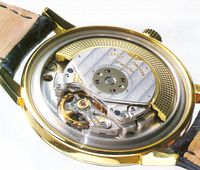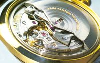 Часы Vacheron Constantin всегда входили и входят в число лучших швейцарских часов. Именно в 60-е годы модели этого старожила Женевы ни в чем не уступали произведениям Patek Philippe и держались на том же уровне дизайна, техники и разнообразия. Годовой выпуск продукции у этих двух женевских часовых мануфактур тоже выражался величинами одинакового порядка. К 250-му юбилею в 2005 году знаменитая часовая марка сделала себе особый подарок: собственное производство часовых механизмов и собственный часовой механизм с автоматическим заводом. Время первых научных часов Vacheron & Constantin с автоподзаводом наступило еще в 1 949 году. Базовый механизм поставляла тогда фирма Jaeger-LeCoultre. Oy был во многом идентичен с IWC Калибром 476, а у Vacheron & Constantin был выпущен с наименованием 477 (модифицированный 477/1). Снабженный пока еще небольшой маховой массой автоматический завод вращался только в одном направлении. Впервые он был изготовлен к золотым мужским наручным часам под номером по каталогу 4871, которые были выпущены в конце 1949 года. В 1955 году последовали первые модели с автоматикой, ротор которой вращался на все 360*. В последовавшие за этим годы поставщиком бронируемых базовых механизмов оставалась Jaeger-LeCoultre. В связи с изменением условий владельцев мануфактуры в круг поставщиков механизмов сперва были приняты Frederic Piguet, а потом - Girard-Perregaux. Ни по техническому уровню, ни по качеству эти фирмы-производители не достигали уровня Jaeger-LeCoultre, но зато их продукция была значительно дешевле. При разработке концепции нового собственного автоматического механизма были заданы конкретные длина и толщина, так как ему нужно было заменить три прежде применявшихся калибра. При диаметре 26,2 мм и толщине 3,6 мм главным оставалось обязательное условие тонкости, и конструкторы опять были вынуждены идти на компромиссные решения. Таким образом, основные компоненты механизма состояли из довольно тонких деталей: платины, мостов заводного барабана и зубчатого механизма, а также кронштейна баланса. Автоматический завод был встроен в оба моста и действовал только в одном направлении -механизм для изменения направления движения ротора едва ли можно было разместить в тесном внутреннем пространстве. Двухплечий баланс работает с плоской спиралью, тонкое регулирование осуществляет система Triovis. Co стороны Vacheron Constantin было дано разъяснение, что Triovis представляет собой лишь переходное решение до тех пор, пока не появится возможность получать от Nivarox тот винтовой баланс, который нам уже известен по Калибру 975 Jaeger-LeCoultre. Отдельная платина со стороны циферблата позволяет расположить различные указатели, включая указатель запаса хода. Общая конструкция нового калибра 2475 выполнена традиционно и выдает почерк ответственного конструктора. Последний поработал прежде в фирмах Nivarox, Frederic Piguet и Jaeger-LeCoultre. Жаль, что он не был знаком с прежним автоматическим Калибром от Vacheron & Constantin. В противном случае он, может быть, кое-что позаимствовал бы из конструкции и стиля этого великолепного технического решения. В общем и целом новый Калибр 2475 Vacheron Constantin представляет собой солидную конструкцию, у которой особенно привлекательно выполнена окончательная отделка. Часы, переданные новой фабрикой в Ле-Сантье для испытаний, производили впечатление диаметром корпуса, указателями дня недели, даты и запаса хода. Даже «Женевское Клеймо
