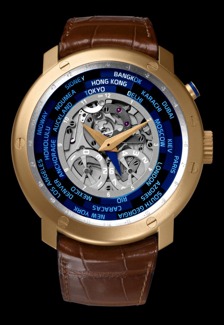 The case, in 18kt gold, measures 50mm. The crystal is sapphire as is the display back. It is water resistant to 30 meters. The Swiss automatic movement (base ETA) displays simultaneously local time and a second time zone for 24 cities with a day/night indicator as well as a large date. Источник: http://forums.timezone.com/index.php...=4554141&rid=0 |