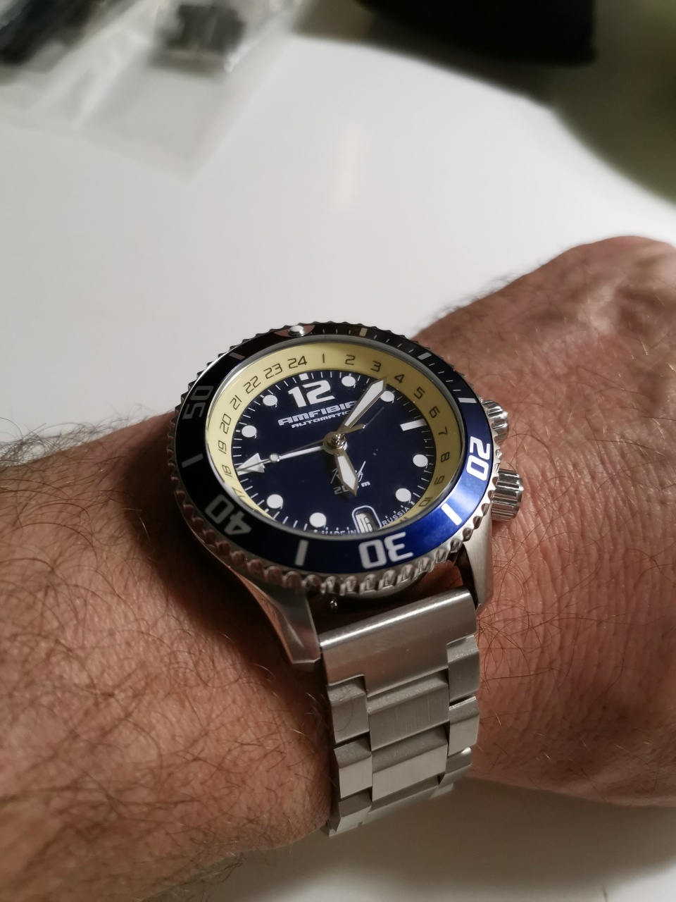 Взял Блигер симастер на Али. Только ради браслета, так как там нет порочащих честь надписей. Отдельно браслеты продают только с гравировкой... Примерил - не подошел. Было бы хорошо, если бы подходили концевики. Но, к сожалению угол прилегания не тот (слишком много снято с верхнего края и получается щель в 1,5мм), хотя радиус закругления очень похож, обводы ушек почти совпали с краями концевиков и отверстия под шпильки совпали.