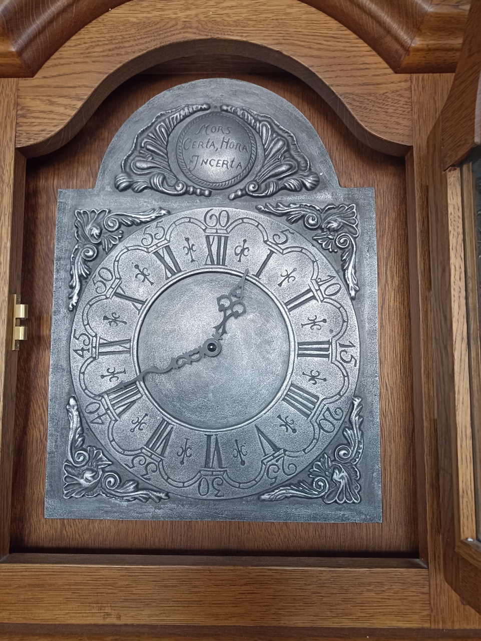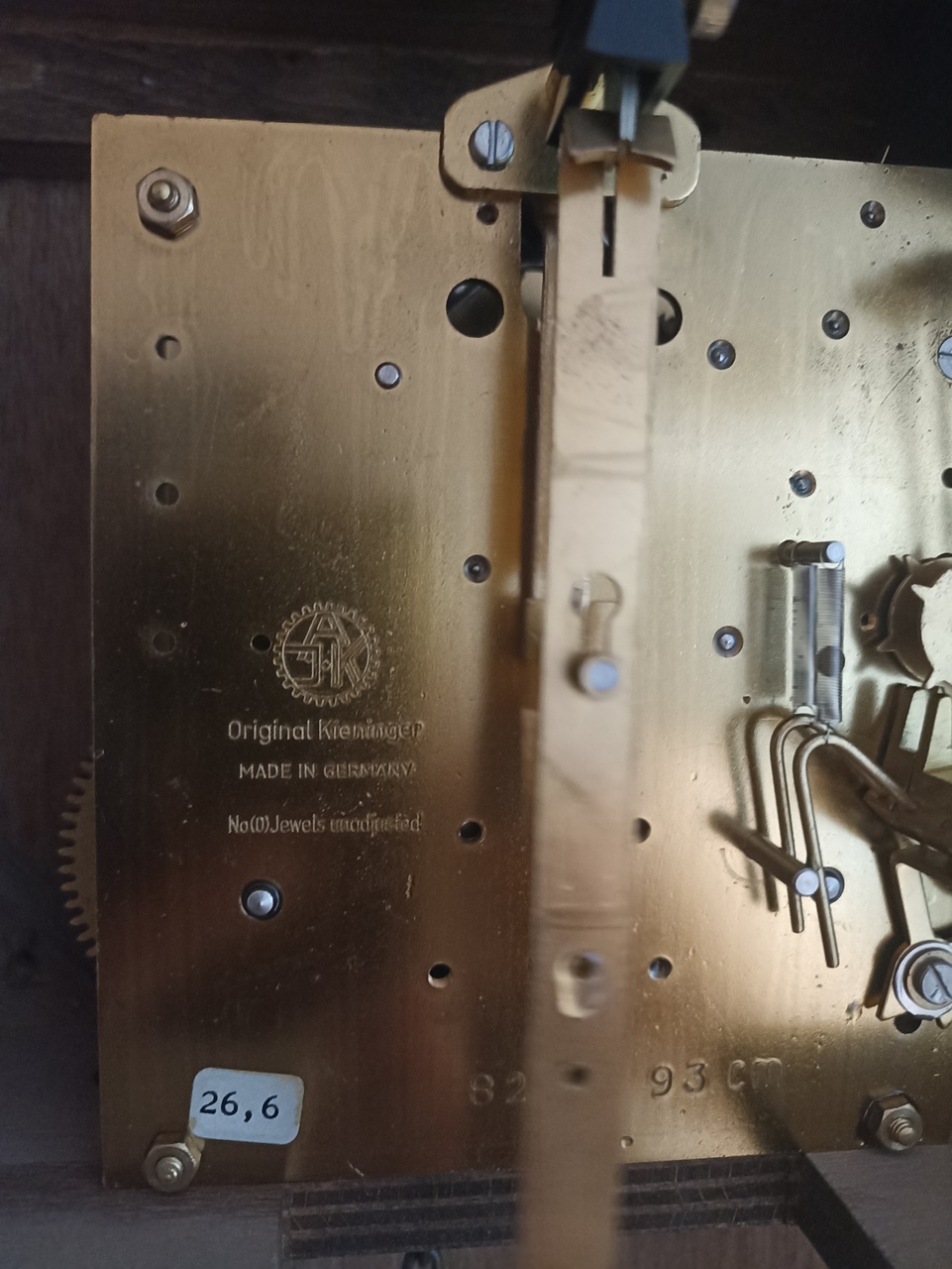 Здравствуйте! Помогите, пожалуйста, определить дату выпуска напольных часов. Понимаю, что Kieninger, возможно послевоенные годы, но помощь специалистов не помешает! На задней крышке часов стоит серийный номер (?) EUTIN 34017. Фото клейма прикрепляю.