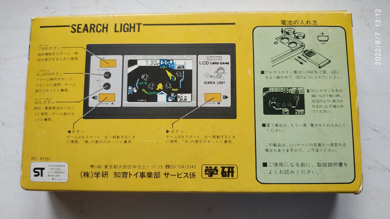 Ещё одна японская яйцеловка фирмы Gakken называется Search lignt, год выпуска вероятно 1982, состояние - новая, с коробкой и инструкцией, даже батарейки родные сохранились не распечатанные, выпуск 82год 8 месяц, наверняка мёртвые. Как сказал продавец - была куплена у одного японца дедушки. Сюжет довольно сложный, надо сбежать из тюрьмы при этом не нарваться на жандармов с собаками, спрятаться от прожектора, разбить тремя ударами (игра А) или пятью(игра Б) стену, сбежать. Ели сидеть в тюрьме игра не заканчивается ни когда, в отличии от тайны океанов где через какое то время водолаз всё равно выталкивается в воду. Вложение 3443540 Вложение 3443541 Вложение 3443542 Вложение 3443543 Вложение 3443544 Батарейки Вложение 3443545 Вложение 3443546 В игрушке дополнительно есть: часы, формат только 12 часовой, будильник и отключение звука. Вложение 3443547 Вложение 3443548 Спасибо за внимание. |