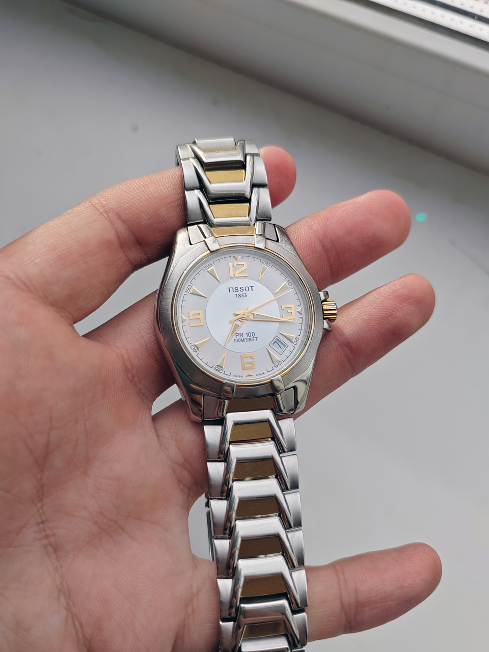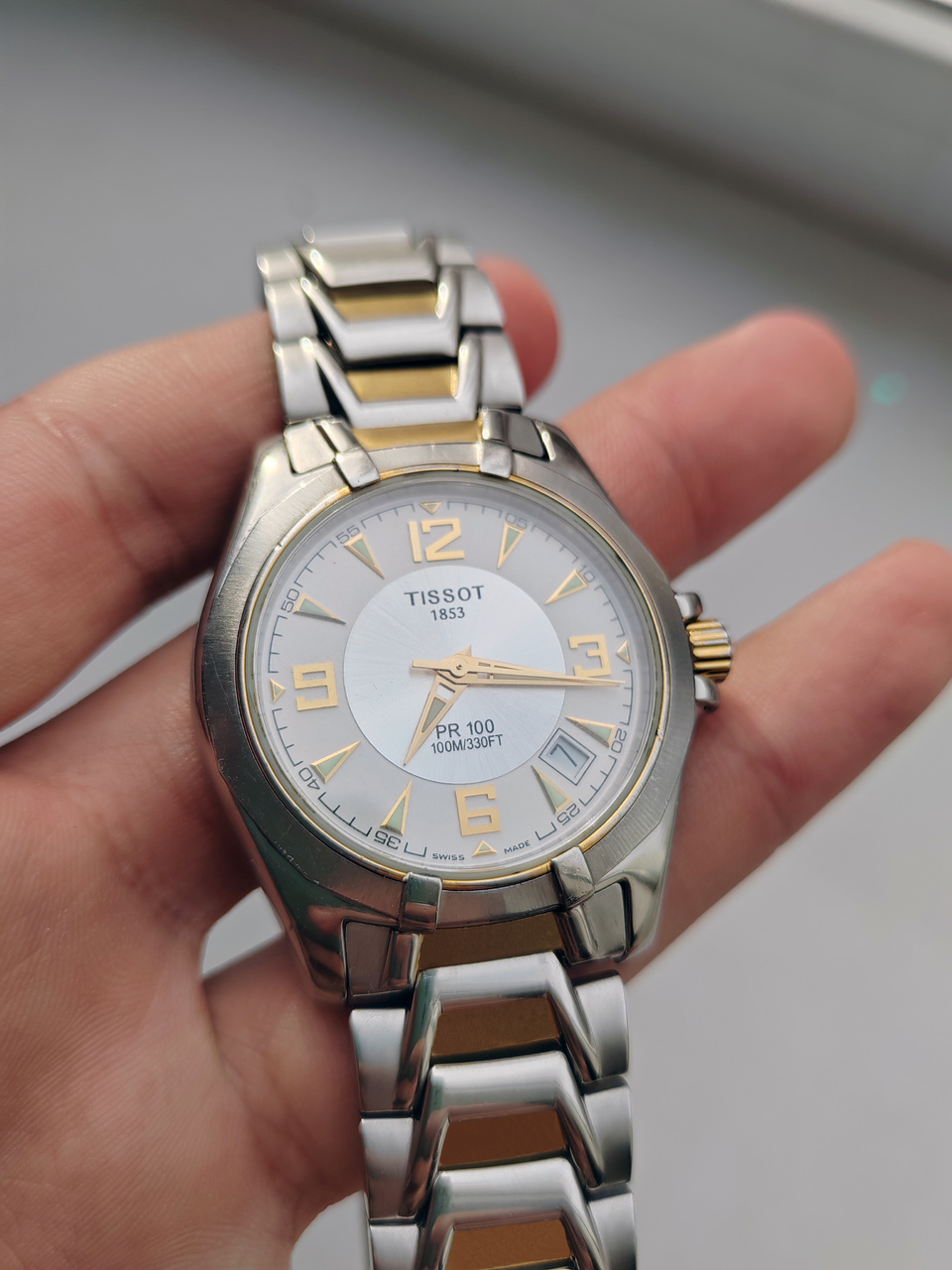 Вот, выкладываю своё приобретение. Не встречал эту модель в биколоре здесь. :rolleyes: Еле откопал реф: Tissot PR100 T14.2.481.32