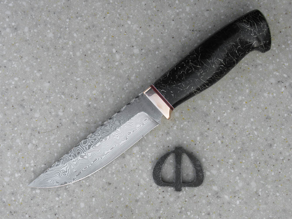 Други,помогите разобраться с производителем ножа.Нож был подарен(за 5 руб конечно) человеком из Нижнего Новгорода.Сталь не мягче Х12,не все камни берут.На ноже есть клейма,подскажите автора.Заранее благодарен.