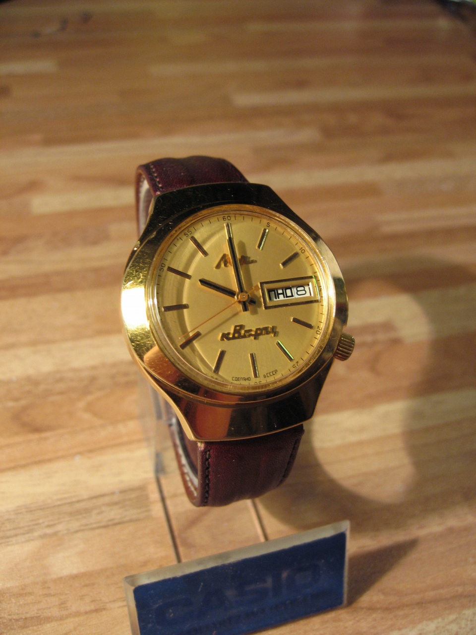 Вложений: 8 Добавился в моей коллекции ещё один Луч 3055, 10-й по счёту. :) Вот фото продавца: Вложение 866606 Этот экземпляр оказался в позолоченном корпусе, с толщиной покрытия 5 микрон. Приехали эти часы ко мне в субботу, 6-го декабря и оказались, как ни странно, на ходу. Это, нужно сказать, первый случай в моей практике. ;) Тем не менее, это не спасло этот Луч от репассажа механики и переделки электронного блока. По механике был выкрошен камень на мосту центрального колеса и ослаблен фрикцион. Из-за износа пришлось также заменить и ленточную пружину, поддерживающую секундный триб. Как при этом работали эти часы, я не знаю. Ну, а дальше наведение лоска - чистка корпуса и полировка стекла. :) Вложение 866608 Вложение 866609 Вложение 866610 Вложение 866611 Вложение 866612 Вложение 866613 Вложение 866618 |