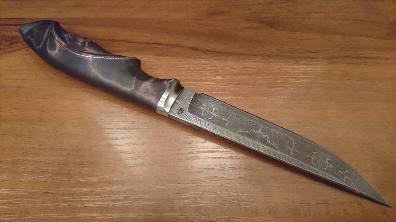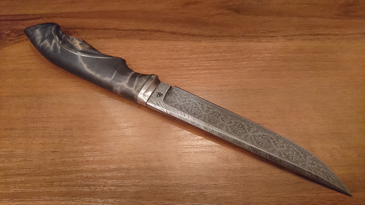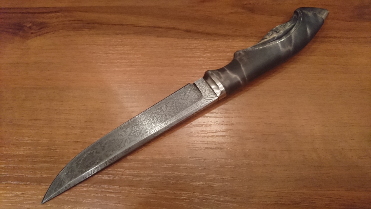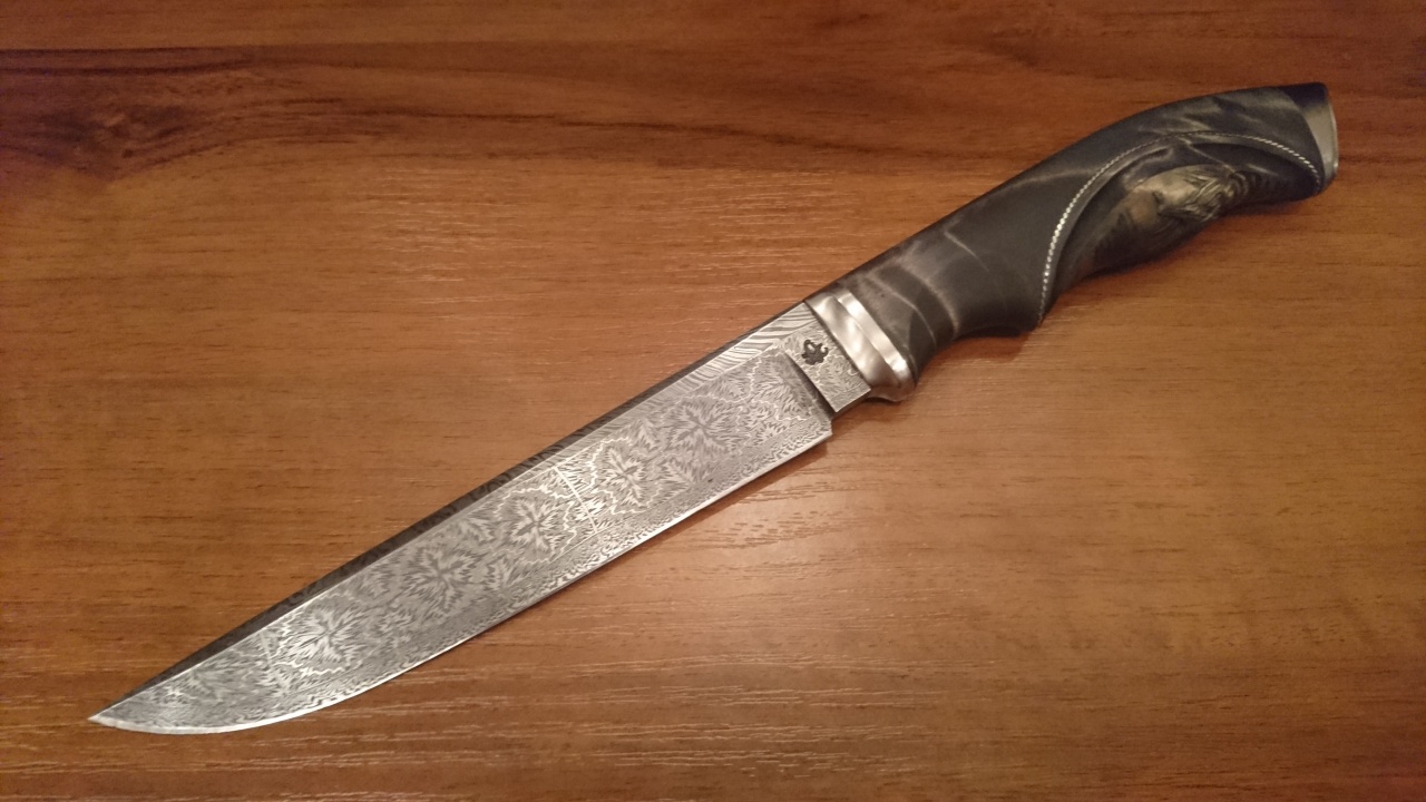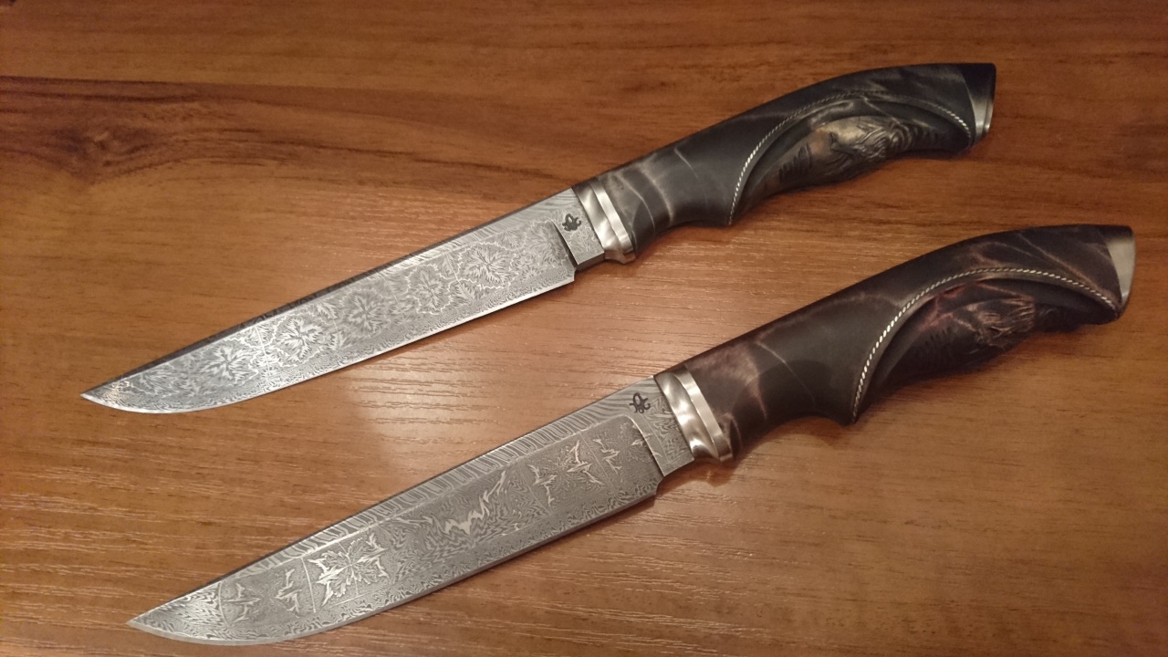 Metal777, рукоять стабилка так был очарован, что забыл спросить название древесины. Больстер и тыльник титан. Исполнение ножей великолепное. Хотелось бы придраться да не к чему разве только ножны простоваты. Вчера даже попросил отложить их до 13.00 сегодня. Долго размышлял, но отказался по причине того, что уже есть пара ножей с нержодамаском, хотя узор конечно не такой бомбезный и мастер их делавший не именитый.