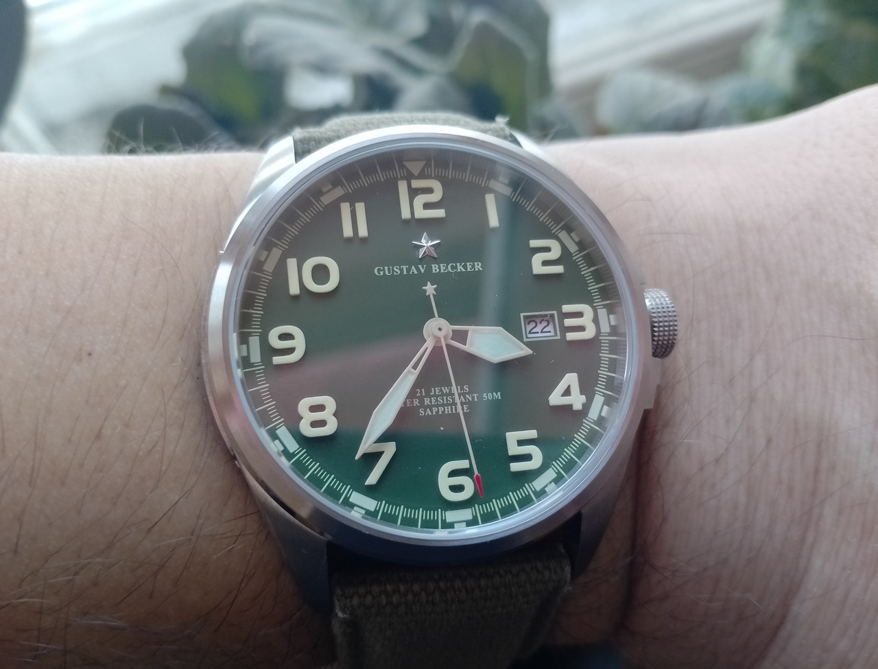 Ну, и наконец-то, приехали ко мне "Китайские Командирские" Gustav Becker :-). Часы очень приятные, ремешок - ужас, дубовый просто и разтреплевается передвижка сразу же, ремешок, однозначно, под замену. Теперь озадачился выбором к ним браслета и пришёл к выводу, что это не простая задача. Хочу именно с полукруглым конечным звеном, чтобы скрывал зазор между дужкой и корпусом часов. На Али выбор не велик.