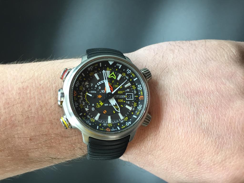Здравствуйте! Решил и я показать свои часики. Приобрел я их ещё лет 12-15 назад в интернет магазине. В то время я носил Тиссо, и эти часы (Ситизен) мне казались чересчур перегруженными всякими наворотами. Я их носил время от времени, тогда они ещё были на родном текстильном ремешке, который не пережил нескольких поездок на море. Последние 10 лет я только их и ношу. Часы удобные во всех смыслах, батарейку я не менял ни разу за всё время владения часами. Выдерживают погружение под воду, хотя теперь иногда появляется испарина под стеклом. Ход часов точный. Люм даже с годами всё ещё довольно яркий.