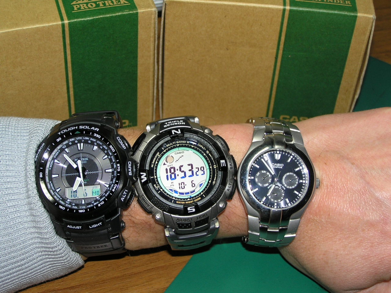 Диаметр без з/г - 38 мм, с з/г - 40 мм, стекло - 30 мм. Не нашел какое у Вас запястье. На моем, 17,5 мм,смотрятся органично, хотя и другие - 45 мм, мне тоже нравятся. З/г не завинчивается (водозащита 100 м - не проверял, вообще ни разу не погружал их - один раз менялась батарейка без замены уплотнителя, поэтому не экспериментирую). Корпус и браслет из нержавеющей стали (частичная полировка и сатинирование - нарядненько так). Царапки мелкие ловятся, однако не критично - с 20 см ничего не заметно. Браслет - штамповка, что чревато в случае повышеной "волохатости":D. Стекло - минералка, вровень с безелем, который в области "12" и "6" часов имеет выступ над стеклом примерно на 1 мм (такая минизащита). У меня стекло без единой царапки (результат "подрукавного" ношения). Все циферблаты функциональны - день, дата, 24-й формат. Раньше все видел прекрасно, сейчас уже в "вприглядку"(зрение садится). На циферблате и стрелках люм - очень слабенький даже по сравнению с другими Casio. По форме корпуса - дело вкуса. Как по мне - привет из "90-х" (отдал отец - плохо видит показания цифера). Ношу сугубо зимой (пока остальные "солнце еды подъедают" на подоконнике), под тугой манжет (удобный, тонкий, обтекаемый корпус) и сугубо "по домашним делам" (гараж и т.д.). Под костюм, кмк, простоваты (для этих целей - "костюмник"), для природы и "открытой руки" сугубо Про Треки. Вот, вкратце, как то так, а Вам решать "о чем это или не о чем". P.S. Хотя модель довольно таки не нова, в магазинах встречал абсолютно новые.;). Вложение 958291 Удачи в выборе! P.P.S. Решил добавить сравнительные фото диаметров на руке - вдруг пригодится для лучшего восприятия размера [ATTACH]Вложение 958293[/ATTACH] |