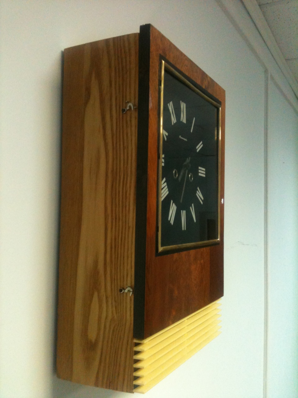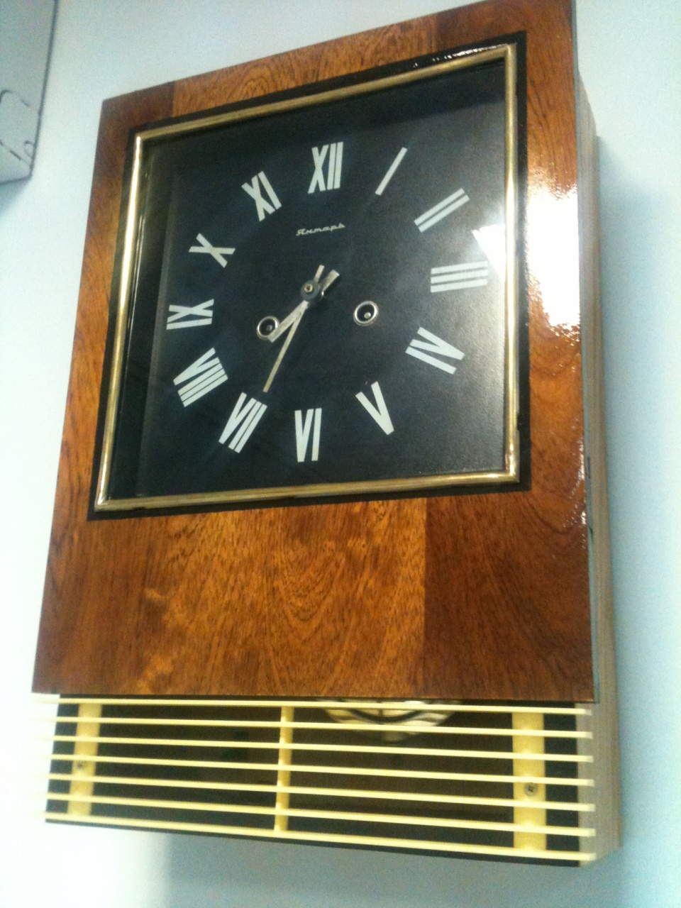 С корпусом практически ничего не делал: не освоил я ещё это искусство, да и не ставил хозяин часов такой задачи. Только оттёр тряпкой, надо будет ещё чуть-чуть подклеить ПВА шпон под циферблатом. Циферблат и захватанную руками линзу маятника оказалось достаточно отмыть посудным средством "AOS". Стрелки купил на Мешке. У механизма 61 года резьба для гайки минутной стрелки меньше, чем у более поздних и такая же, как у четвертных ОЧЗ. Идеально подошла гайка от советского циркуля. Такой вот вполне симпатичный образец. Такие же часы висят в Саратовском краеведческом музее, в экспозиции, посвящённой 50-м годам. |