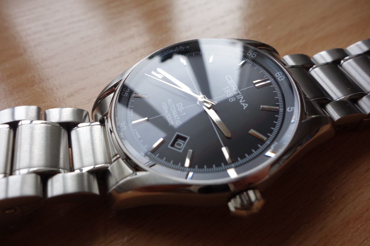 В общем, подумал еще, понял, что DS First – не тот стиль что я хочу сейчас, DS-1 Day-Date с золотом неок, DS-1 Day-Date с черным цифером все же напрягает белой секундной стрелкой и белым фоном дня недели, и взял самый универсальный вариант - DS-1 на браслете. Глухой ночью ничего не видно, ну да ладно. А вот браслет на второй примерке понравился больше.