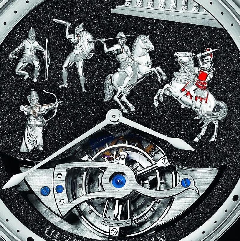 Круглый корпус, диаметром 44 мм, водонепроницаемый до 30 метров. Сапфировое стекло с антибликовым покрытием на лицевой стороне и на его задней крышке. На угольно-черном циферблате, выложенном слоем мелких искусственных кристаллов алмазов, располагаются пять жакемаров в виде Александра Великого одетого в доспехи, верхом на коне и других воинов, вступающих в бой. Их движения синхронизированы с боем репетира. На 6 часах размещен турбийон. Модель оснащена механизмом с ручным заводом UN-78, диаметром 27,6, толщиной 8,5 мм, на 36 камнях, с запасом хода около 70 часов, функциями минутного репетира с Вестминстерским боем и четырьмя гонгами, жакемарами и турбийоном. Калибр отменно отделан и декорирован. Черный кожаный ремешок с золотой застежкой. Вложение 111821 Источник: http://www.horozima.com/2011/03/ulys...urce=BP_recent |