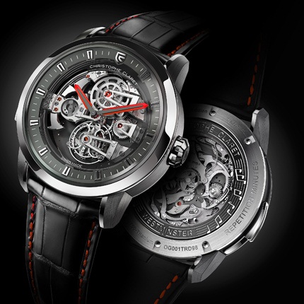 Новинка имеет круглый корпус, состоящий из трех компонентов: безель и задняя крышка выполнены в белом или розовом золоте золоте или в платине, а центральная его часть - титановая (поскольку титан обладает превосходными качествами звукопередачи). Его диаметр составляет 45,0 мм, толщина 15,3 мм, водонепроницаемость 30 метров. На левой стороне корпуса имеется рычаг управления минутным репетиром, на 3 часах - заводная головка. Сапфировое стекло установлено на передней стороне корпуса и на его завинчивающейся задней крышке. Циферблат, как таковой, отсутствует; на фланце расположены накладные часовые индексы; часовая и минутная стрелки с красной окантовкой. Модель оснащена скелетонизированным швейцарским механизмом с ручным заводом, с балансовой частотой 21600 полуколебаний в час (3 гц), 72-часовым запасом хода, функциями индикации часов, минут (посредством соответствующих центральных стрелок), а также с турбийоном и минутным репетиром с вестминстерским боем. Калибр декорирован и отделан в соответствии с требованиями высокого часового искусства (Haute horlogerie). Поставляется на кожаном ремешке. Лимитированный выпуск по 8 экземпляров каждой версии модели. Вложение 312402 Источник: http://www.worldtempus.com/en/news/t...nute-repeater/ |