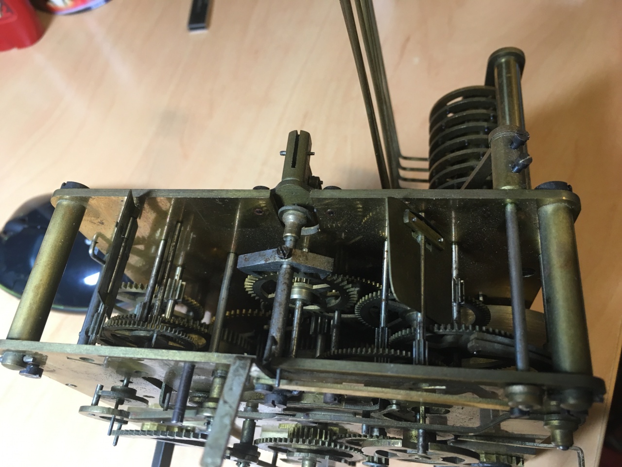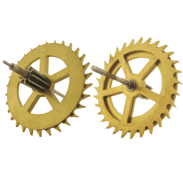 Отвёз хозяину, поставил в корпус. Оказалось, что верхние кронштейны механизма к корпусу вообще не крепились, поэтому мы с хозяином часов укрепили внутри корпуса деревянные кубики и к ним шурупами прикрепили эти кронштейны. Сам корпус сделан весьма добротно, единственное замечание - нет винтовых регулируемых ножек (у тех же ОЧЗ они есть). Полочка с механизмом не вынимается из корпуса (закреплена к направляющим шурупами с боков), поэтому, чтобы снять механизм, надо снять стрелки, кольцо с цифрами (четыре винтика поменьше тех, что крепят заднюю крышку у "Весны"), снять сам циферблат (ещё 8 таких же винтиков) и только потом снять механизм. При сборке все эти 12 винтиков надо ещё не уронить. Кто это выдумал?! В конце концов часы пошли. Но через день отказал бой часов, пришлось ехать снова. Не работал бой часов, как оказалось, из-за того, что, звёздочка, которая поднимает молоточки, "проела" в рычаге бороздку глубиной десятки 4! Звездочка очень тонкая, а рычаг вообще сырой. И стала звёздочка сама застревать в этой бороздке Загладил я это безобразие напильником, а у звёздочки зубья через один чуть отогнул в сторону (как у циркулярной пилы), чтобы она работала по большей площади рычага. Ещё заметил погнутый зуб у одного из трибов в механизме боя часов. К счастью, погнут был только край, в нерабочей зоне. Выправил, но он выправился очень легко, возможно, треснул. Да и твёрдость триба тоже не ахти какая. Пока всё работает, решил не трогать, при следующем обслуживании (лет через 5) надо будет в разобранном виде посмотреть и подумать. Нагрузки там небольшие, думаю, пока и так поработает. В целом, качество механизма не дотягивает до тех же настенных четвертных ОЧЗ, не говоря уж о напольных. По поводу датировки могу только предположить, что часы годов 70-х - 80-х, не раньше, судя по пластмассовым декоративным элементам и пластмассовым бойкам молоточков вместо кожаных. Кстати, опознать механизм так и не удалось. Ещё одна его особенность - дополнительный "паразитный" триб в механизме боя часов. Знатоки, подскажите, что за механизм такой! |