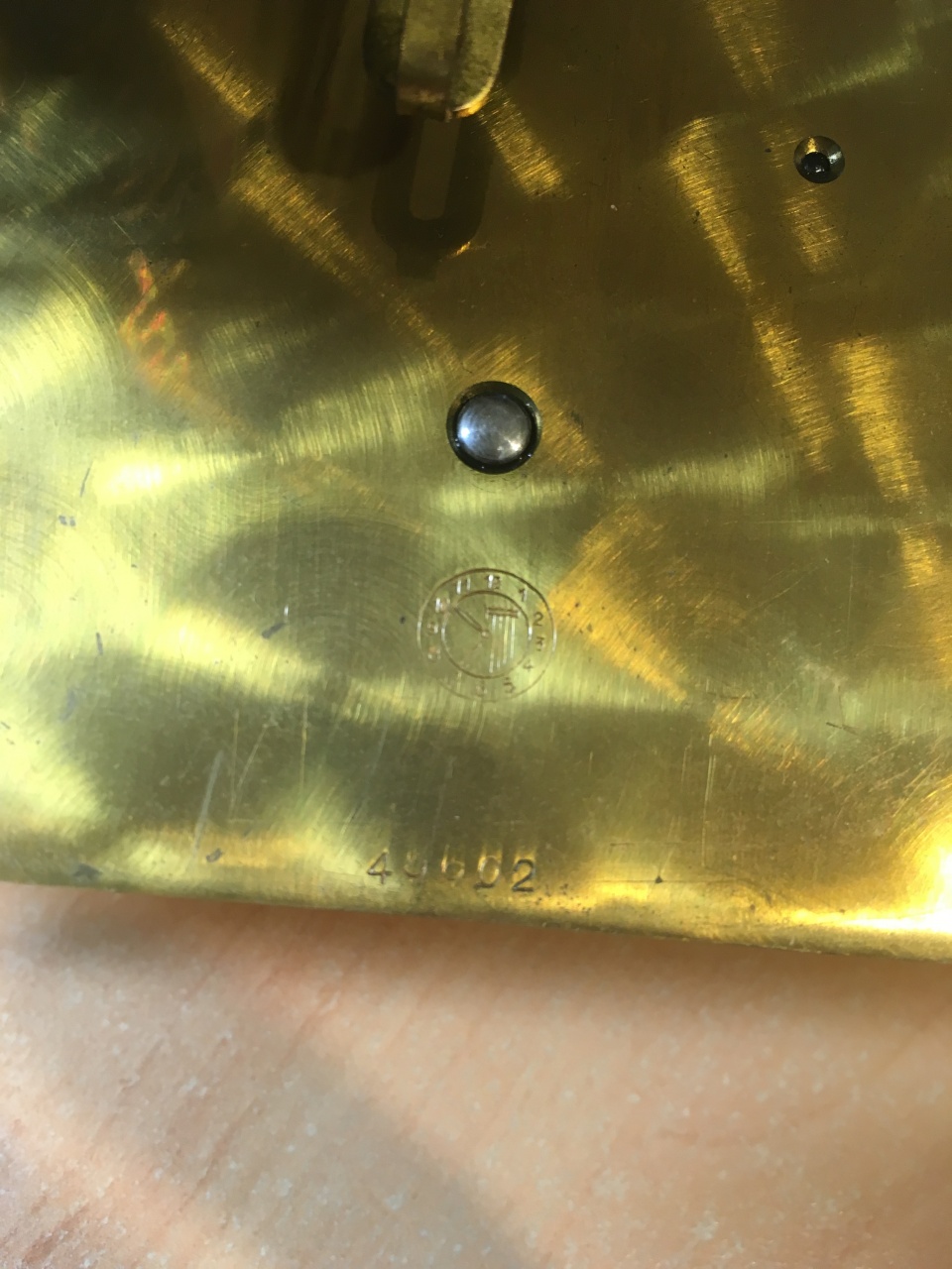 Недавно упомянутые в первом посте часы были отремонтированы. После чистки и смазки, вроде, пошли, но при каждом обороте анкерного колеса один щелчок был какой-то двойной. Стал смотреть и обнаружил: стремясь сделать автоматическую установку выкачки, какой-то горе-конструктор (не боюсь этих слов!) выдумал зубья довольно сложной формы с кончиками толщиной всего 0,3 мм!! У часов-"годовиков" концы зубьев толще... Один из этих кончиков отломился, ещё штук 8 были погнуты... Видно, кто-то когда-то с силой рванул за гирю. Я снова разобрал механизм, снял злосчастное колесо. Погнутые зубья выправил, на месте сломанного сделал прорезь пилкой от лобзика, впаял латунную пластинку и опилил надфилем. С другой стороны анкерного колеса нанёс каплю припоя для балансировки. Часы пошли, только из-за конструкции маятника с крупной жестяной деталью звук ход тоже "жестяной", с этим ничего сделать не удалось. Не столько шумит механизм, сколько резонирует маятник. Пружинка на гире хода оказалась самоделкой, она была навинчена на кусок шпильки, который был ввёрнут в гирю всего нитки на две резьбы! Когда я гирю вешал, всё это развалилось и она едва мне на ногу не упала! Судя по помятому низу гири, она уже падала. Сделал я вместо всего этого безобразия крючок из велосипедной спицы и закрепил винтом М5. По просьбе хозяина часов пружинку оставил.