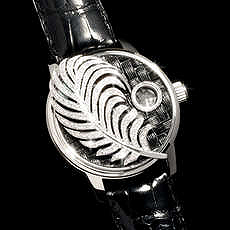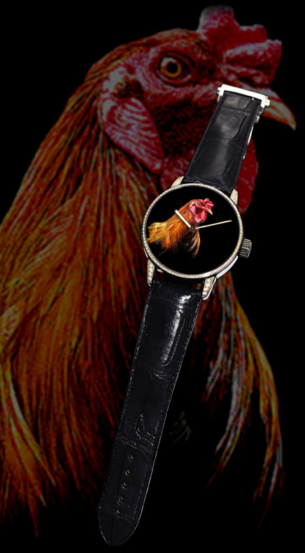 Time Gallery Artisan Timepiece Collection The 18kt rose gold case measures 41.7mm and has 1.8 carats of diamonds (pave style). Movement is a Swiss made automatic. A pink gold high relief engraved roaring tiger, decorated with brilliants, mounted on a pink gold medallion with black Japan lacquer background. Pink gold aperture with sapphire crystal for the digital hours, shown on a black sapphire disk, alligator strap with folding buckle. Источник |