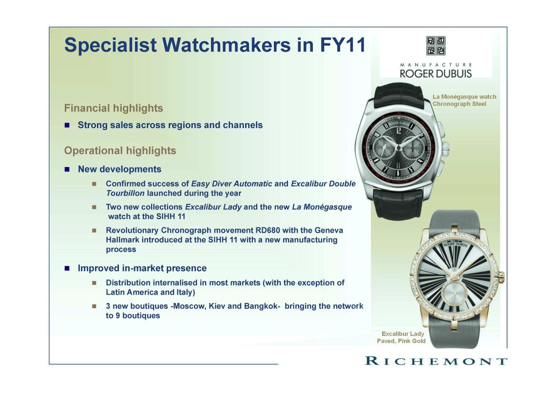 Появилась информация о приобретении группой Richemont компании NET-A-PORTER LLC за 225 миллионов стерлингов ($ 343 млн). Интересы группы охватывают несколько самых престижных брендов в часовой индустрии, в том числе - Cartier, Van Cleef & Arpels, Piaget, Vacheron Constantin, Jaeger-LeCoultre, IWC, Panerai и Montblanc, владельцем которых она является.