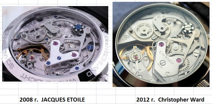 Видите ли Артем, за каждым механизмом стоит зачастую конкретный часовщик, его придумавший. Особенно это касается старых разработок. Конспирология это "неплохо", но экспертиза по картинкам дело сомнительное. Откуда же взялся этот монопушер на базе Юнитаса? Немного истории. James Aubert в начале 20-го века основывает свою мастерскую в долине Joux. Именно там он занимается доработкой и усложнением часовых механизмов, изобретя много всего интересного. При этом основная специализация это разработка хронографов. Думаю все в курсе о его изобретениях. Свое дело он передает своим ученикам - племяннику Жану и своему зятю Jean Fillon. К сожалению James Aubert умирает в довольно молодом возрасте (59 лет). Именно зять становится директором и ведущим часовщиком и продолжает дело тестя. Особое внимание при этом уделялось работе над хронографами, а бизнес соответственно был расширен в сторону производства часов для спорта и авиации. Я не уверен точно, но я находил упоминания что Jean Fillon в 40-х участвовал в разработке Unitas 6497, который был представлен в 1950. Что впрочем неудивительно, совместные разработки были нормой для тех лет. Johannes Jahnke молодой талантливый часовщик из Германии заканчивает свое обучение в Гласхютте и поступает в абитур к Марко Ланге на должность Konstrukteur. Если я правильно помню, то Йоханнес познакомился с Марко в возрасте 16 лет. Тут действительно уж очень юный талант. В этой абитур было одно примечательное событие. Обычно для успешного завершения обучения (дипломная работа) нужно было спроектировать модель спуска. Ситуация была парадоксальной, потому что несмотря на свой юный возраст Йоханнес к тому времени уже это сделал вместе с Марко. Выход был найден - Марко предложил Йоханнесу несколько вариантов на выбор по созданию нового механизма. Были разработаны разные концепции, и Йоханнес должен был выбрать одну. Будучи энтузиастом классических хронографов, он долго не думал об этом - выбран был хронограф монопушер с центральным счетчиком. Дипломная работа завершилась успехом. Johannes получил Master watchmaker, а у компании Lang&Heyne появился знаменитый King Albert of Saxony. Думаю не будет лишним упомянуть, что все детали часов Albert №0 от и до Йоханесс сделал собственоручно на старых станках, коллекцией которых так знаменит Марко. Так Johannes оказывается одной ногой в AHCI и в его будущем ни у кого не сомнений. Но Янке отказывается от AHCI со словами "я не хочу, чтобы мои часы лежали в сейфе, я хочу чтобы их носили" и уходит работать техническим директором и часовщиком в Christopher Ward, где начинает с разработки усложнений на базе калибров ЕТА. Первым становится прыгающий час. Если мне не изменяет память свой прототип хронографа на Unitas 6497 Йоханнес показал в 2009году и этому предшествовало три года разработки. Johannes Jahnke со своими разработками обратился к Jean Fillon, который, несмотря на почтенный возраст далеко за 80, продолжал работать в полную силу. Совместно два этих часовщика и создали калибр JJ02. За основу были взяты естественно эскизы разработки Jean Fillon середины 20-го века, проведена полная деконструкция Unitas и реконструкция хрона с помощью CAD и последующая доработка. В результате появился совместно созданный новый механизм с новыми платиной, мостами, системой завода, системой колес. Сборка С900 Single Pusher осуществлялась вручную Йоханнесом Янке. Теперь что касается JACQUES ETOILE. Это молодая компания основанн