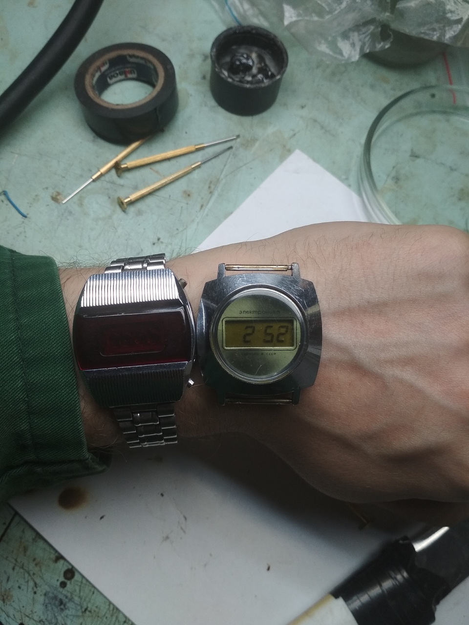 Часы пока мое увлечение (так я себя успокаиваю). А в гараже (который тоже требует денег на ремонт, чтоб стать Мастерской) прозябают 5 (!) токарных и один фрезерный станок и почти столько же единиц мототехники... Поэтому я всячески стараюсь сэкономить на материалах и инструменте (тем более таймграфере) при работе с часами. Хотя, признаюсь, мне это очень интересно... Кстати, у нас в городе нашел в продаже ППЧ в рабочем состоянии за 5500р:rolleyes:... Ну а теперь рубрика "вести с полей" Электроника "Терминатор" опять подколола меня, отстав за 2 часа на 15 минут...А позже и вовсе показала мне "смерть кварца"...."Какого х..на?!" подумал я и опять полез с паяльником в механизм и тут же зацепился за ещё одну Электронику 1 (только уже ЖК), подаренную знакомым часовщиком.. Терминатора я поначалу вылечил очередной пропайкой кварца. А поковырявшись с ЖК Электроникой решил тоже заменить кварц ибо она запустившись на секунду, потухла и больше не включалась..И я не нашел ничего лучшего как попытался припаять туда кварц с Терминатора (конечно, встать со стула и порыться в хламе я разумеется не догадался). Попытки удержать волосковым пинцетом бочкообразный кварц привели к тому что он ускакал от меня и его поиски ни к чему не привели. Глядя на уже двое "мертвых" часов я задумался и все же оторвался от стула и наковырял в запасах Кварц от материнки - для ЖК Электроники (потому что места там больше чем у Терминатора) и кварц от медиаплейера для Терминатора. В итоге запустились оба меха чему я бесконечно рад. Стрелочные ЗиМ в карманном корпусе исправно идут, кстати. Немного фото Вложение 3219454 Вложение 3219455 Вложение 3219456 Вложение 3219457 Вложение 3219458 Вложение 3219459 Вложение 3219460 Вложение 3219461 Вложение 3219462 Вложение 3219463 |