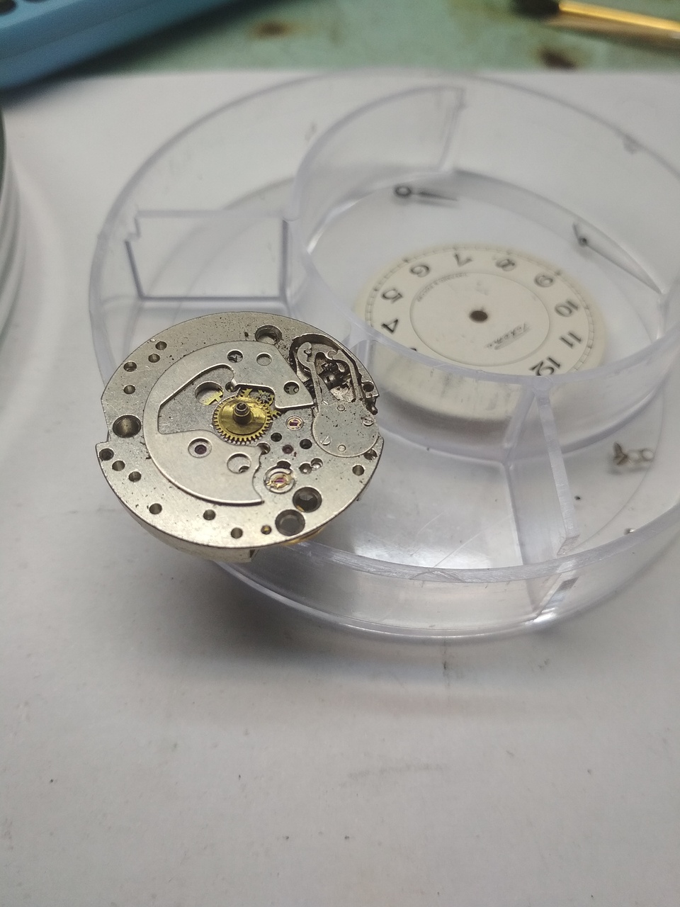 На прошлой четверке (работаю 4 через 4 ) некогда было "взяться за перо", а на выходных - просто некогда. Сейчас буду наверстывать... Итак Терминатор пока жив, не ношу - надоел. ЖК Электроника 1 потухла за время моих выходных и попытки её реанимации ни к чему не привели, пока отложил. Карманные завел - идут, но спешат. Скорее всего надо ещё лезть в узел баланса. Пока тоже не к спеху. Гвоздем нашей программы будут Часы Командирские с календарем. Калибр видимой маркировки не имеет, но, подозреваю это 2414. Вобщем, принес коллега на работе. Сказал память о деде, почини если получится. А я как раз взял накануне кучку из 40 шт. разномастных часов. А там были несколько экземпляров этих часов. НУ, сморщился я, попробуем (у самого давно лежат Восток с календарем, но побаиваюсь лезть)... Вобщем открыв крышку обнаружил что конец волоска выпал из рычага выкачки (терминологию до конца ещё не выучил, так что извините). "Хорошее" начало, подумал я.. Попотев минут 40 заправил волосок на место, оценил перекос спирали "в горизонте", сморщился и продолжил разбирать... Вобщем, чтоб сэкономить время читателя, скажу что в этом механизме были следующие проблемы: - кривая спираль баланса - сорванная заводная пружина (отломан привареный в конце "хвостик") - съедена часть зубов часового колеса - сломана накопительная пружина календаря (не, не я её сломал) И это не считая ржавчины и грязи в механизме. По итогу я скидал родной механизм и разобрал один из доноров и перемыл/перебрал его. На донорском механизме также была сорвана заводная пружина, и этот узел пришлось брать с ещё одного донора. Там пружина была уже "доработана" - конец отожжен и загнут крючком для зацепа за барабан. "Познакомился" с бушонами. Пока не помыл/смазал - баланс нормально не заработал. По итогу часы пошли и "тестируются" на руке. Корпус, кстати, мыл так же как и механизм - Арсеком. Результат отличный. |
