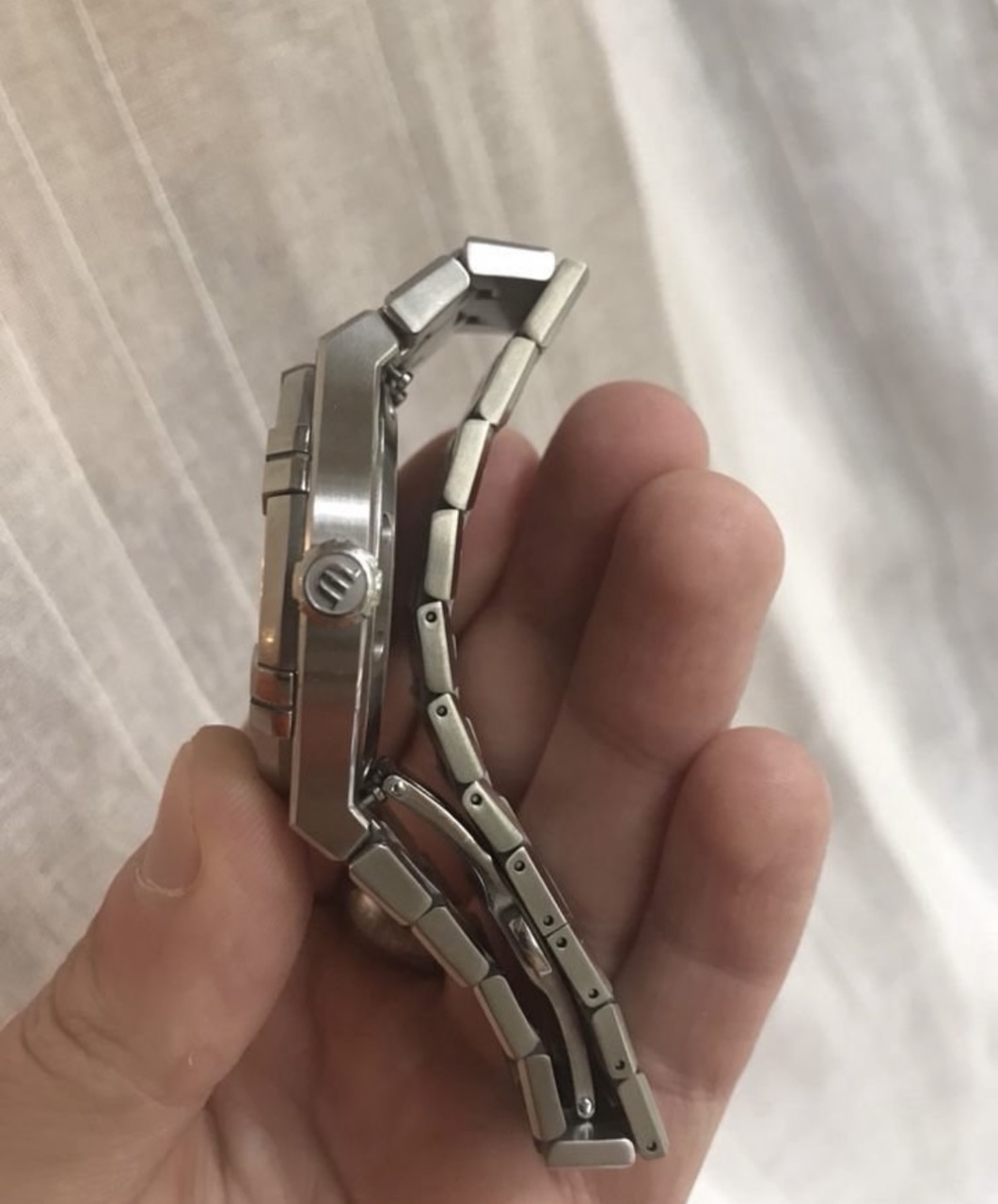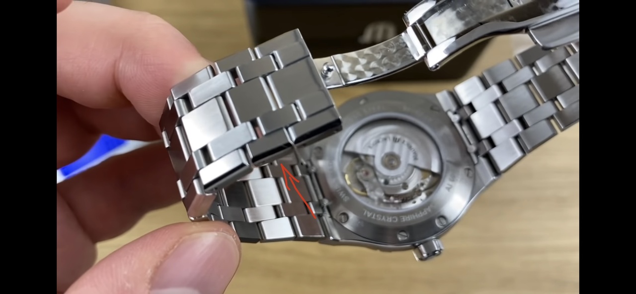 Не знаю, как у ТС (и не знаком с этими, часами) , это звено на фотке визуально кажется меньше? План - поставить обычное и снято это. Если оно было, но уже нет, то видел на форуме темы с поиском звеньев, может и мастерские могут в этом помочь.