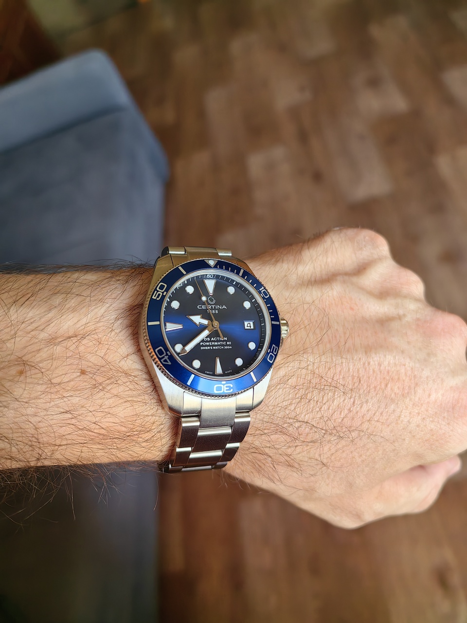 Началось все с того, что расстался с SKX007, которые хоть и искренне нравились, но ощущение, что пора переходить на следующий уровень, не покидало. Да и дизайн, и комфорт этой модельки Сейко, все таки не являлись для меня идеалом. Пересмотрел кучу Проспексов. Пару раз почти покупал. Сначала SBDC101, но понял, что с текущим ощущением часовой эстетики для моего запястья (плоское, 16.5 см) все таки великоваты. Вторыми почти приобрел солнечные SBDN073 PADI. Очень уж размер был подходящий и на руке сидели просто максимально комфортно. Оттолкнули общее ощущение игрушечности и вычурные стрелки. Продолжил искать "маленькие" дайверы: капитан кук, винтажные кварцевые сейки с вечником, кварцевые омеги ... Но случайно натолкнулся на виновника темы и был очень приятно удивлен - никаких дат на 4,5 часа, классического вида стрелки, отличные маркеры, тонкое изящное наклонное кольцо. Не фанат наплывов на з.г., но тут стилистически хорошо выдержаны. Для себя выделил приятные мотивы не столько Submariner, сколько Explorer, к которому питаю определенные чувства. При этом никаких циплоков и хомажества, вполне самобытные часы. Смотрел на вторичке, но с нынешними геополитическими рисками и хорошей скидкой + кэшбэком от известного маркетплейса, все таки решился на покупку новых. Сами часы не разочаровали: размер для моих габаритов вправду отличный, очень комфортная не выпирающая задняя крышка, гравировки достойные (з.г. и задняя крышка), аккуратное окошко даты с фасками. Прям все порадовало! Но вот браслет... Нет, он крепкий, литой (и крайние звенья, и две части застежки), дайверское удлинение есть и половинчатые звенья... Но мне не хватает комфорта. Сужение (с 19 на 18) по факту практически не чувствуется. 19 на 16 (а в идеале 18 на 16) было бы гораздо приятней для этого размера часов. Застежка длинная и толстая. Я бы предпочел такую, как у большого собрата по серии, без фиксатора сверху. С одной стороны еще и намертво пристегнута к половинчатому звену. Звенья-половинки несколько раз переставлял на разные концы браслета, чтобы добиться лучше посадки. Крайние звенья, "мужские", добавляют длины, и, на мой вкус, могли бы быть скруглены сильнее. Например, как на базовых кварцевых GS, которые просто "облизывают" руку. Понимаю, что очень многие недостатки браслета не проявляются на более крупном запястье. Но этот размер, кмк, предполагает, что большинство владельцев будут иметь узкие или средние запястья. Немного ценителей, которые довольствуются 38-ми миллиметровым дайверам на запястье более 18 см. И привычки к таким браслетам нет - основной опыт с японскими "погремушками". Но все равно расстроен, особенно на фоне удовлетворения от часов, как таковых. Прошу дать совет и поделиться опытом, что можно попробовать. Часы брались, как основные на лето, поэтому либо другой браслет, либо каучук. Хочется полного прилегания к корпусу, поэтому начал искать каучук, как на DS Action 41 (на втором фото). Оригинального Certina на 19 мм пока не нашел - думаю его пока что нет (а может и никогда не будет) в природе. Есть мысль попробовать "алишные" 19 мм каучуки "под корпус" для Акватерры, как бюджетные вариант проверки совместимости. Просто, если совместимость есть, то поле для экспериментов становится гораздо бОльшим: браслеты с "женским" крайним звеном от Uncle Seiko - первое, что приходит на ум. А дальше можно и еще какие-нибудь "aftermarket" покопать. Обыч
