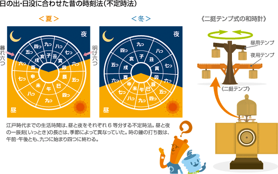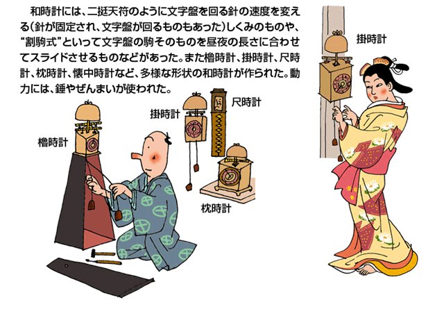 Вложение 26925 Японские часы : 和時計 [вадокэй] ==> часы (традиционные) 時計 [とけい] [токэи] ==> часы Японские часы использовали двенадцатичасовую систему, сутки были поделены на две части, которые ещё делились на 6 дневных и 6 ночных промежутков — «часов». Отсчет дневных часов начинался с рассвета, ночных — с заката. в японской системе дневные часы были длиннее в летнее время и короче в зимнее, и наоборот. Вложение 26926 Вложение 26927 Вложение 26928 Вложение 26929 Вложение 26930 В японских часах использовался дополнительный механизм для звуковой индикации времени, это были часы с боем. Часы отбивали от 9 до 4 ударов, сигналы от 1 до 3 были заняты для указания начала молитвы у буддистов, поэтому не использовались. На начало дневного и ночного периодов (рассвет и закат) часы отбивали шесть ударов. Большинство японских часов использовали в работе сложную систему противовесов. Подобные механизмы использовались в японских механических куклах каракури. Отсчет времени вёлся в обратном направлении. Такой порядок отсчёта сохранился из-за традиционного использования японцами процесса горения благовоний для измерения времени, при этом отсчитывалось количество оставшегося времени. Вложение 26931 Вложение 26932 Вложение 26933 Вложение 26934 Вложение 26935 Вложение 26936 Шесть дневных часов начиная от рассвета (Знак зодиака - Символ - Цифра - Количество ударов): Кот (кролик) - 卯 (у) - 六 - 6 (рассвет) Дракон - 辰 (тацу) - 五 - 5 Змея - 巳 (ми) - 四 - 4 Лошадь - 午 (ума) - 九 - 9 (полдень) Коза (овца) - 未 (хицудзи) - 八 - 8 Обезьяна - 申 (сару) - 七 - 7 Шесть ночных часов начиная от заката (Знак зодиака - Символ - Цифра - Количество ударов): Петух - 酉 (тори) - 六 - 6 (закат) Собака - 戌 (тори) - 五 - 5 Свинья (кабан) - 亥 (и) - 四 - 4 Крыса (мышь) - 子 (нэ) - 九 - 9 (полночь) Бык - 丑 (уси) - 八 - 8 Тигр - 寅 (тора) - 七 - 7 Названия часовых промежутков не были связаны с числом ударов колокола. Каждому «часу» соответствовал знак одного из животных восточного Зодиака, который и служил для него названием. Первые механические часы появились вместе с голландцами. Вложение 26937 Вложение 26938 Вложение 26939 В 1873 году согласно указу японского правительства в стране была введена западная система исчисления времени с постоянной величиной часа и григорианский календарь. Вложение 26940 Вложение 26941 Вложение 26942 Вложение 26943 Вложение 26944 Часы на здании музея часов в городе Matsumoto. Имеют самый большой в Японии маятник. Вечерами часы подсвечивают: Вложение 26945 Часы в Токио: Вложение 26946 Источник: http://www.liveinternet.ru/users/2988966/post114094856/ |