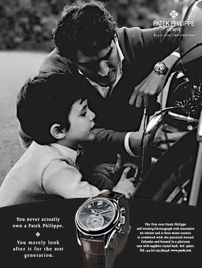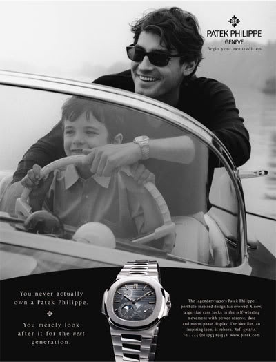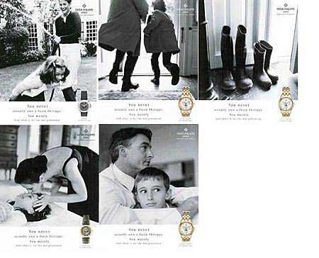 Patek Philippe отмечает более чем десятилетний успех своей рекламной кампании Generations, начатой в 1996 году. Эта кампания оказалась настолько удачной, что некоторые другие марки начали использовать в своих проектах похожее рекламное сообщение. Фотоработы несут в себе глубокий философский смысл, а именно: Вы никогда не становитесь владельцем Patek Philippe. Вы просто бережете его для следующего поколения. Сообщение, которое больше похоже на мантру, подкреплено рядом идиллического вида фотографиями. http://surlaterre.ru/wp-content/uplo.../07/patek2.jpg Главный предмет изображения - семейные ценности, а также общение пап и мам с наследниками своих кланов. Среди слащавости можно найти вполне даже умилительные снимки. Над проектом работали такие фотографы, как Пегги Сирота, Питер Линберг, Марден Смит, Жанлу Сьефф, Мэри Эллен Марк, а также Эллен фон Унверт. Еще несколько снимков: http://www.watchtribune.com/blog/ima...ions-4-420.jpg http://www.watchtribune.com/blog/ima...ions-2-420.jpg http://www.watchtribune.com/blog/ima...ions-1-420.jpg http://www.watchtribune.com/blog/ima...ions-7-420.jpg http://www.watchtribune.com/blog/ima...ions-6-420.jpg По материалам: http://surlaterre.ru/blog/4504 и http://www.watchtribune.com/blog/pos...nerations.aspx |