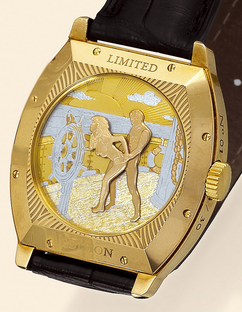 Дизайн новой уникальной модели Le brassus erotic minute repeater caroussel от швейцарского часового бренда BLANCPAIN отличается сочетанием классического стиля оформления циферблата и лицевой стороны корпуса, с фривольным эротическим гравированным изображением на его задней крышке.