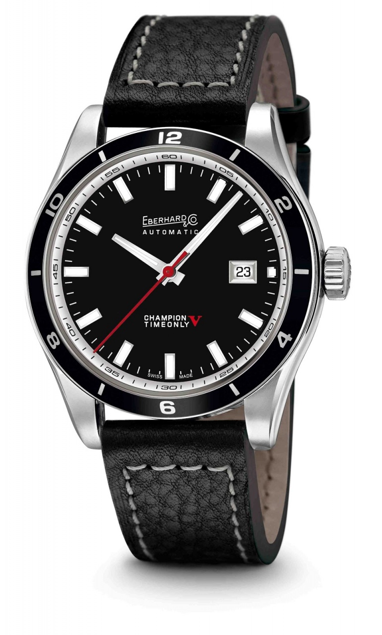 Новая модель Champion V (Ref. 41031) от швейцарской часовой компании Eberhard имеет круглый корпус из нержавеющей стали, диаметром 42,50 мм, толщиной 11,00 мм, водонепроницаемый до 100 метров. На торце рифленой завинчивающейся заводной головки, расположенной на 3 часах, выгравирован логотип бренда (E&Co). Безель с круглой алюминиевой вставкой и с 12-часовой разметкой. Задняя крышка из полированной и сатинированной нержавеющей стали, на шести винтах. Сапфировое стекло с антибликовым покрытием защищает циферблат белого (с черным фланцем), черного (с белым фланцем) или синего цвета (с фланцем белого цвета). Накладные часовые индексы, часовая и минутная стрелки с люминесцентным покрытием белого цвета. Секундная стрелка красного цвета.