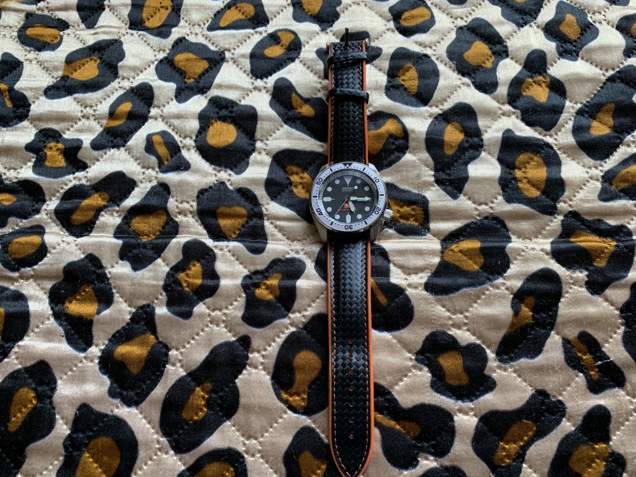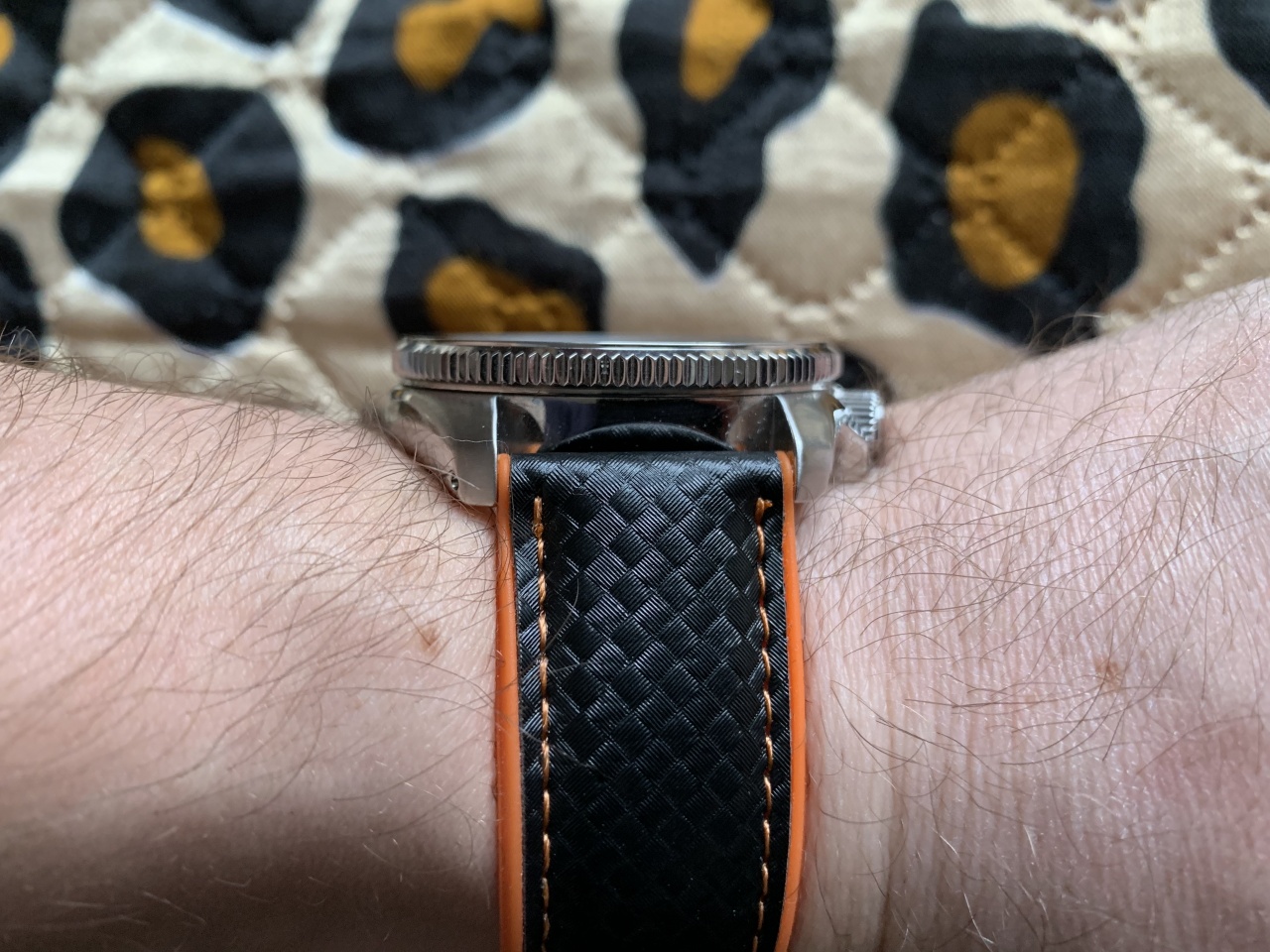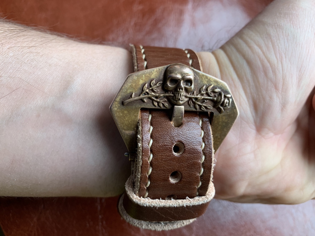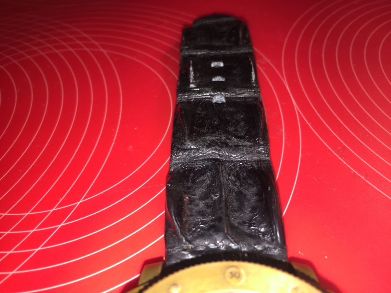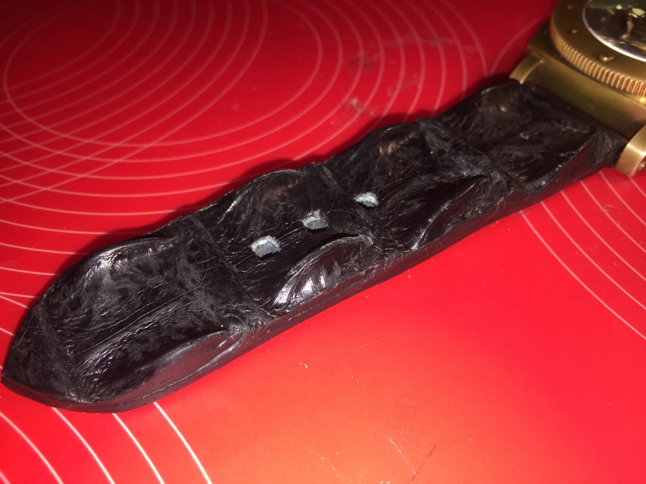 Хотелось чего-нибудь горбатого. Увидел у мастера не совсем обычный для ремешков рельеф на куске аллигатора рядом с головой веселой весенне-летней расцветки. Получилось вроде неплохо.