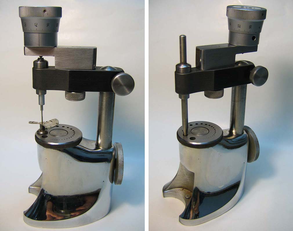 Здравствуйте! Посмотрел приспособление, показанное mishinmaster , и решил показать свой инструмент. Я для его изготовления микрометр приварил к металлической пластине, а на подвижной губке сделана проточка диаметром 2,5мм. Для работы с камнями другого диаметра изготовляются необходимые насадки и закрепляются на проточке. Более подробно об изготовлении приспособлений из микрометров можно прочитать в книге Гусельникова В.А. и Сидорова И.Н. " Ремонт часов".